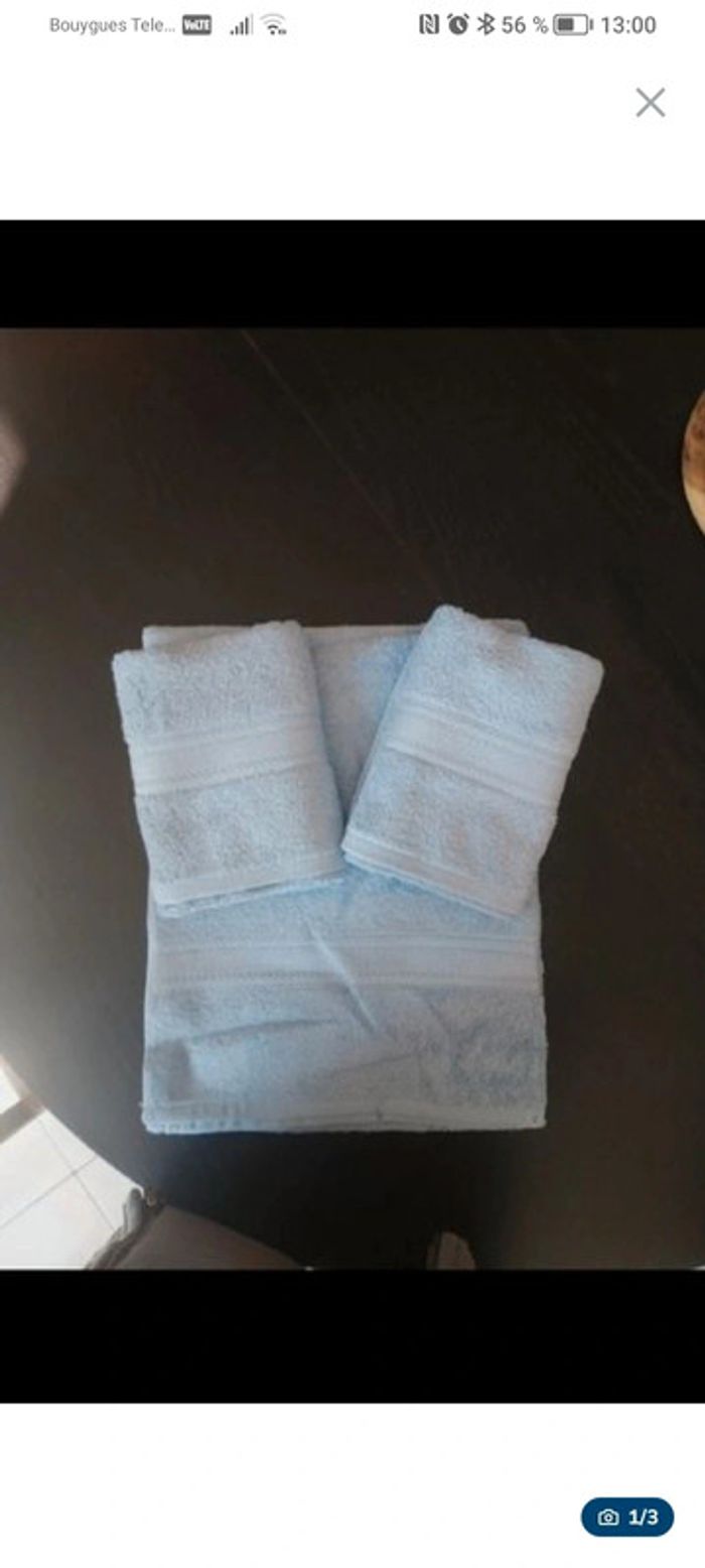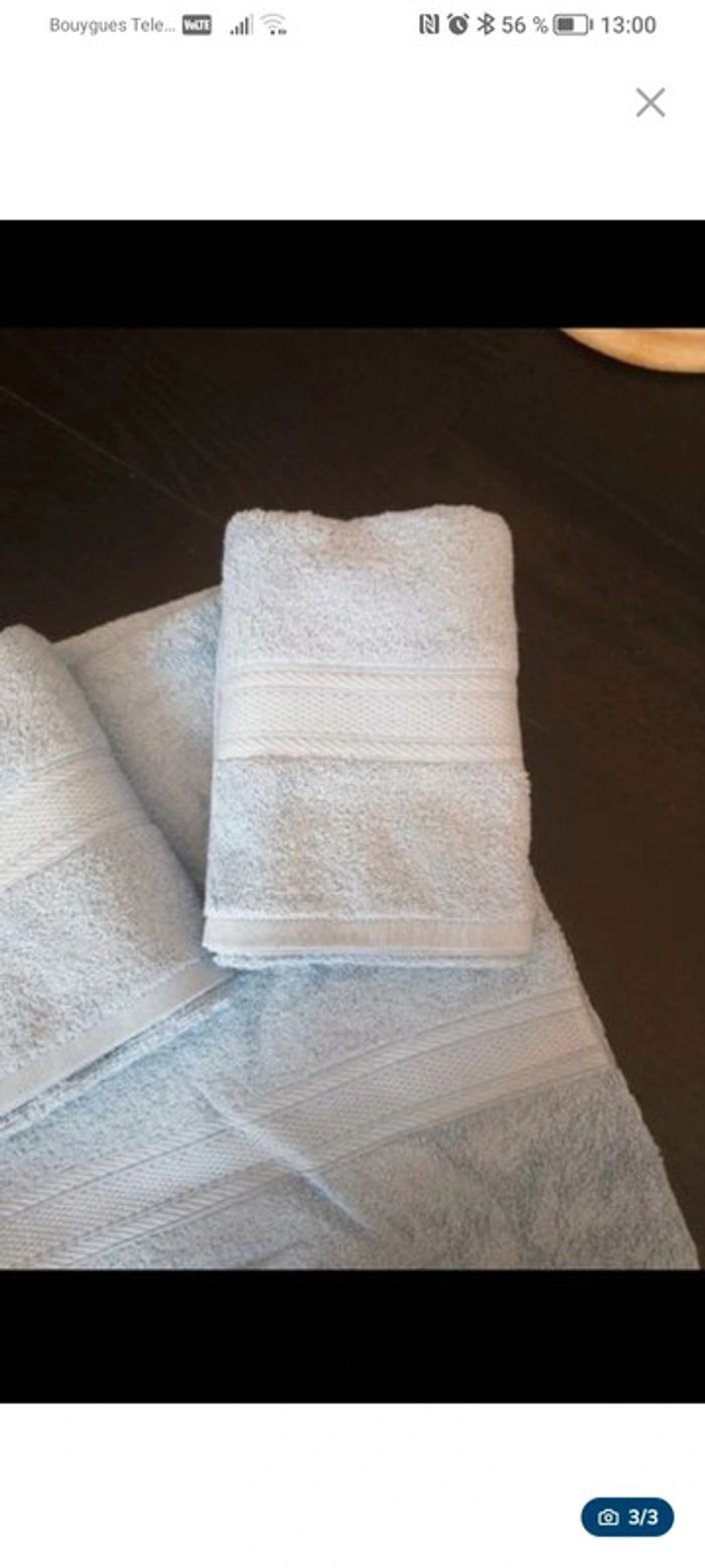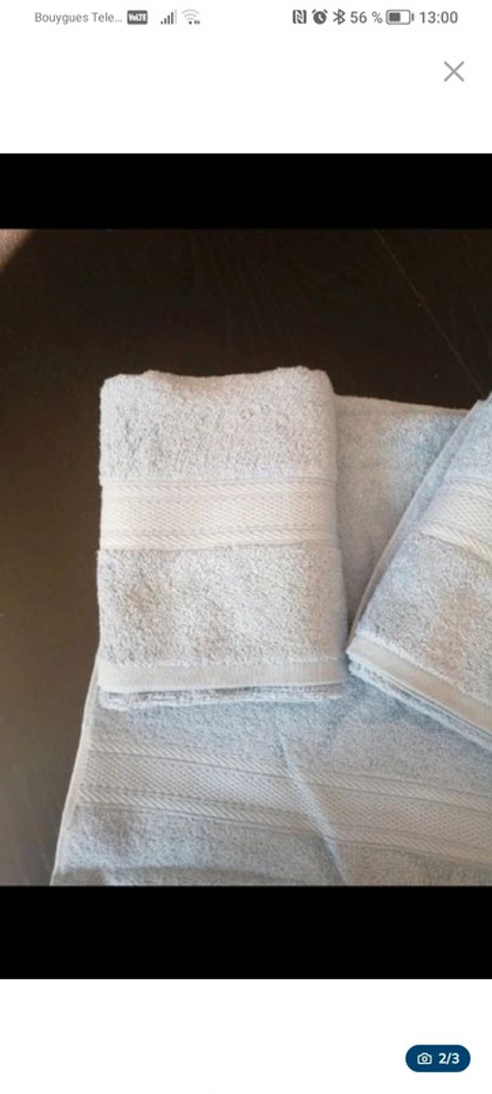 Lot de Serviettes Neuves 2 serviettes 50*90 1 Serviette de bain 70*140 2 gants Passage en machine à 90° Si besoin d autres quantités hésitez pas à me poser la question