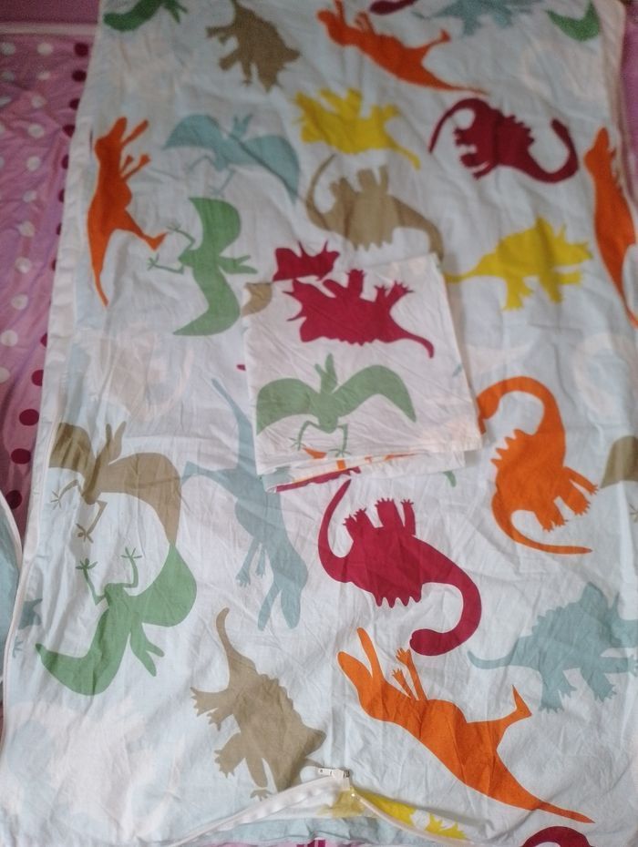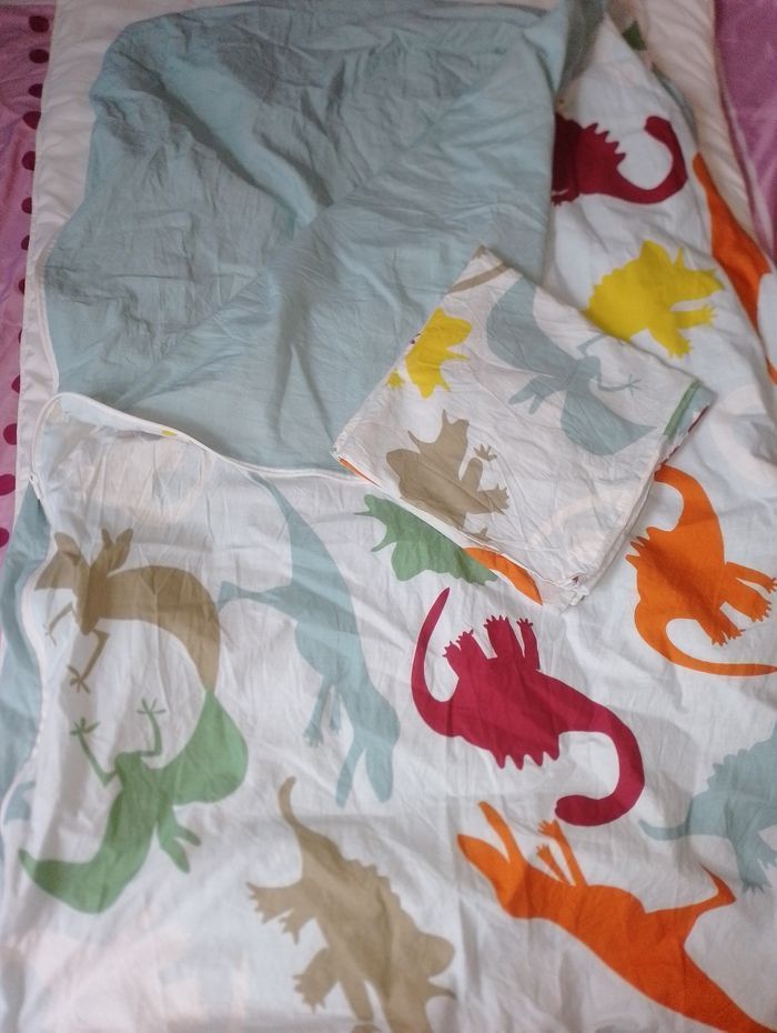 Parure prêt à dormir dinosaure DINO Caradou Verbaudet Pour lit d'enfant Motif dinosaure DINO 90x140cm pour lit evolutif Drap housse attaché par un zip ( fermeture éclair) de chaque côté de la housse de couette ce qui permet a l'enfant de dormir bien au chaud dans ses draps et non a l'extérieur du lit quand les draps sont enlever lorsque l'enfant bouge beaucoup Drap + housse de couette + taie d'oreiller 55 euro # Couette neuve encore avec l'étiquette également dispo à la vente 35euro