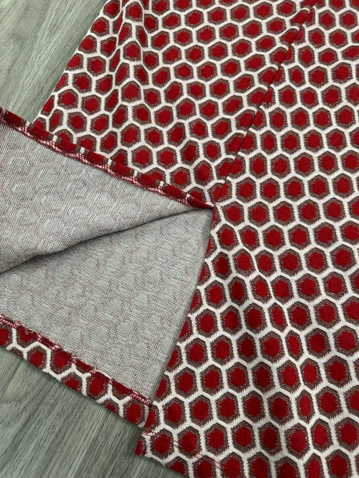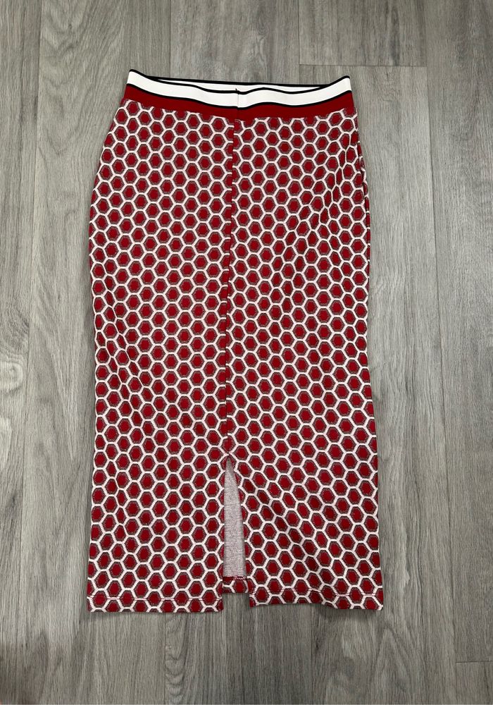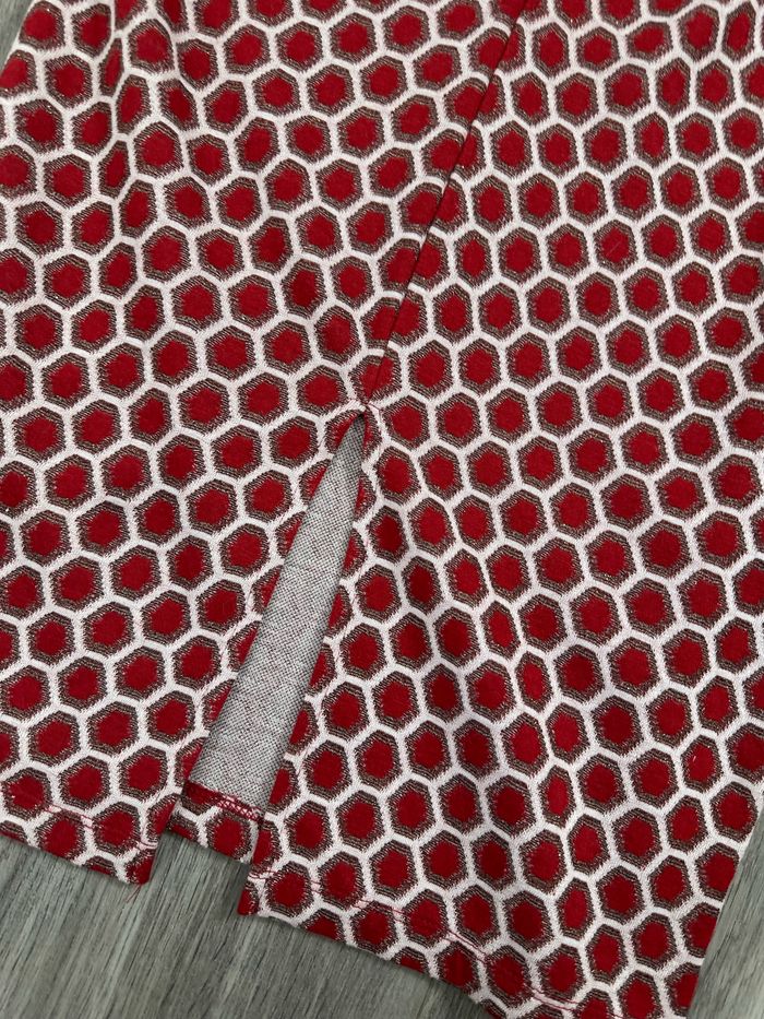 Jupe tube - Excellent état - Taille 36 équivalent S - Rouge bordeaux et doré - GP&J Baker H&M - Imprimés nid d’abeilles - Bande élastique à la taille - Tissus super stretch - Fendue sur le bas - Polyester, viscose, fibre métallisée, polyamide Dimensions: - 34 à 47cm à la taille - 76cm de long