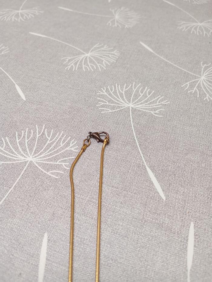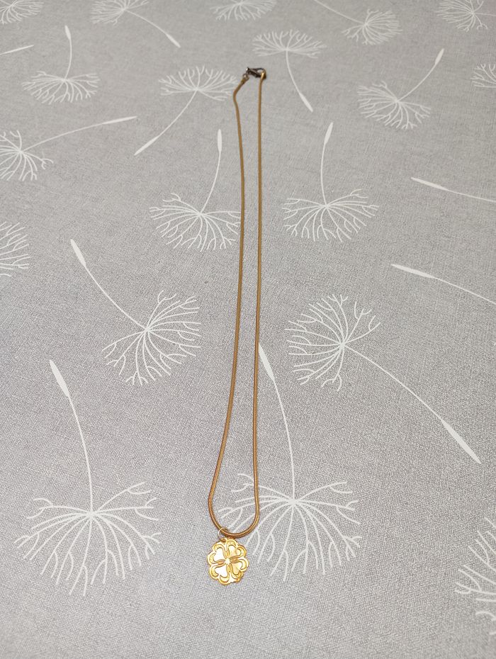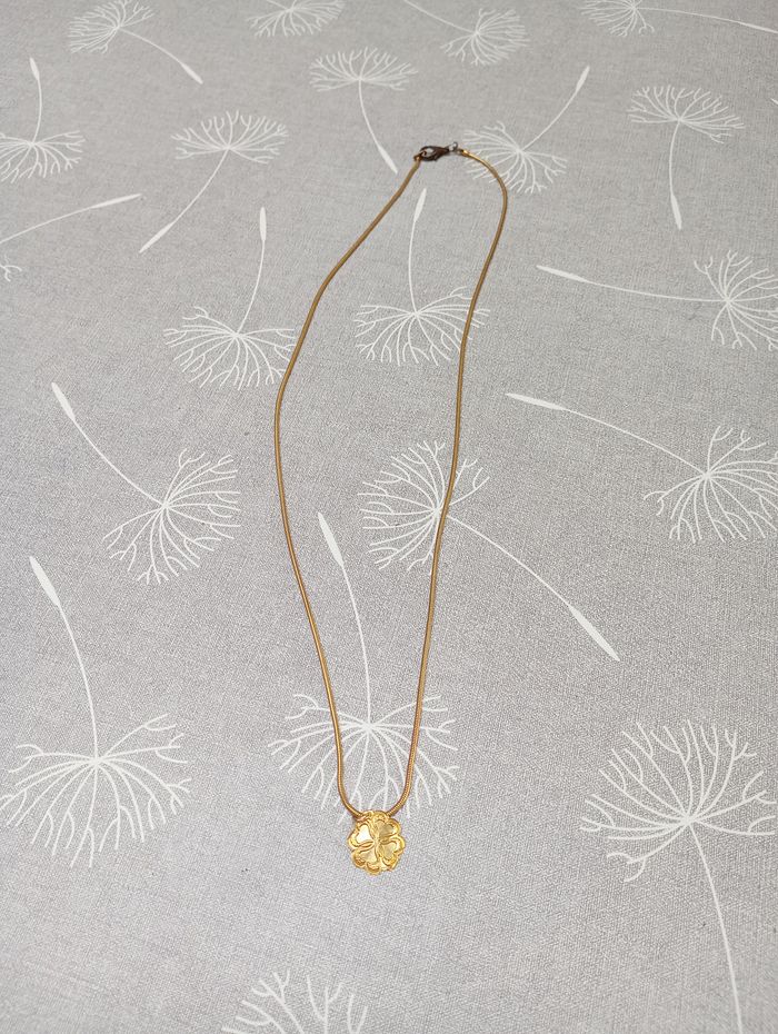 Collier doré avec un pendentif en forme de trèfle (fin et léger). Longueur : 35 cm. Diamètre trèfle : 1,6 cm. Le fermoir est décoloré.