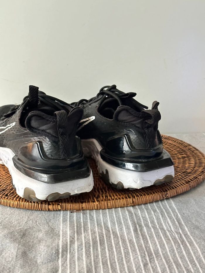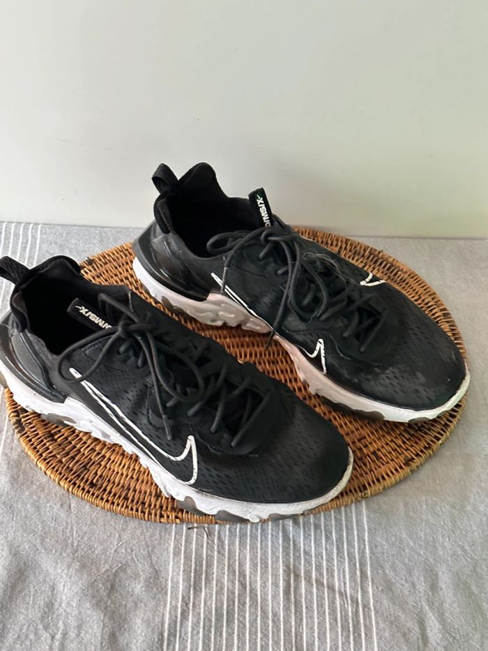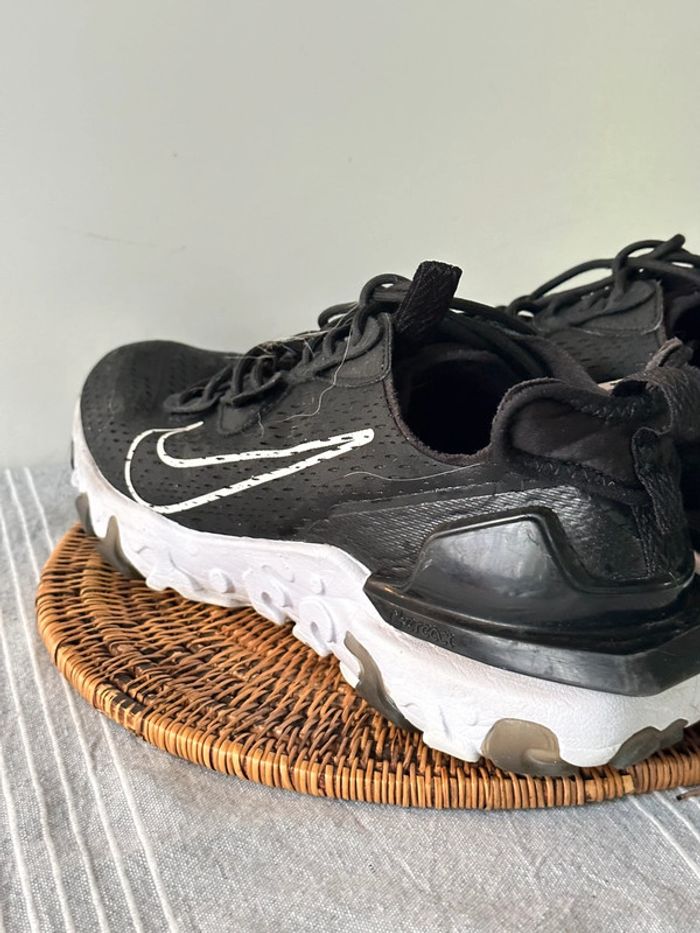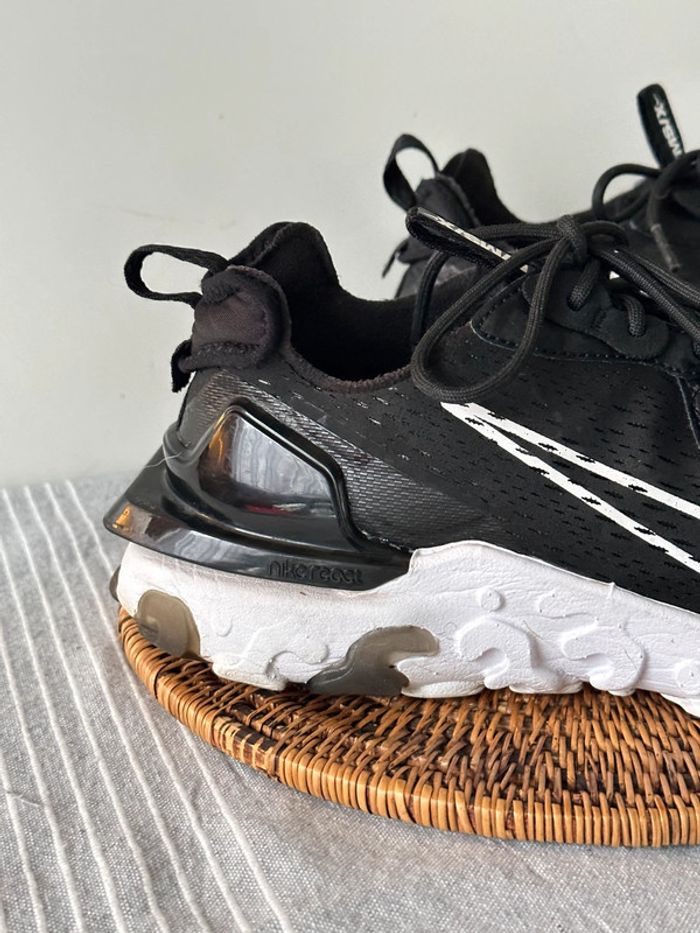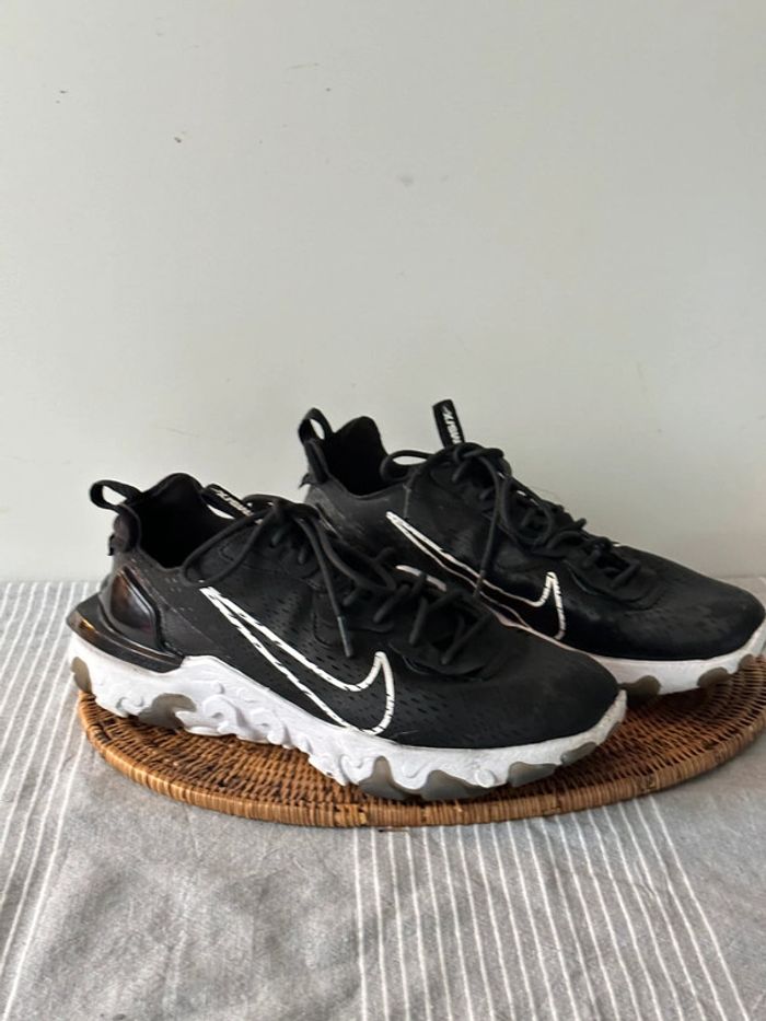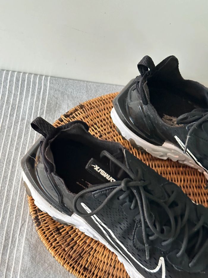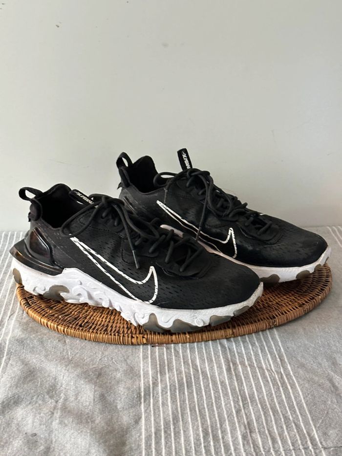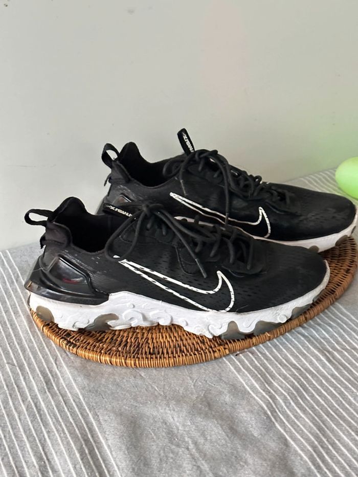 👟 Nike React Vision - Taille 44 • Marque : Nike ✅ • Modèle : React Vision 🏆 • Taille : 44 👣 • Couleur : Noir avec semelle blanche ⚫⚪ • État : Très peu portées, en très bon état ✨, semelle très légèrement décollée sur la chaussure de droite • Confort : Technologie Nike React pour un amorti optimal 🏃‍♂️💨 • Style : Look moderne et sportif, parfait pour un usage quotidien ou le sport 🔥