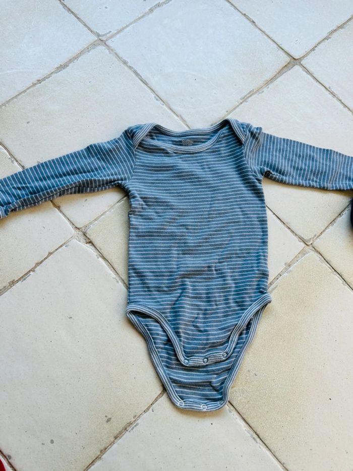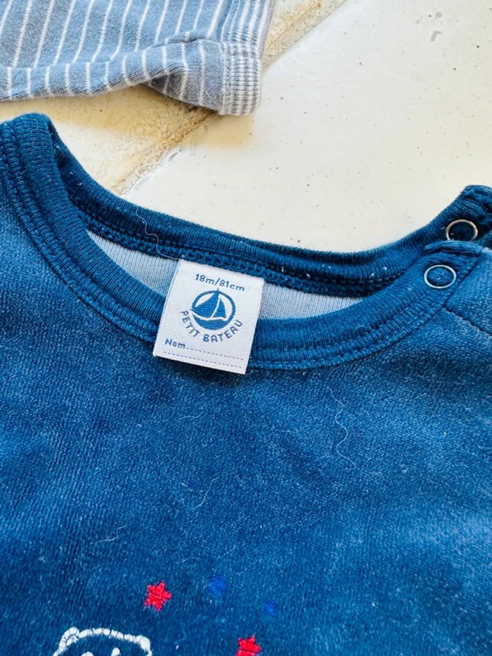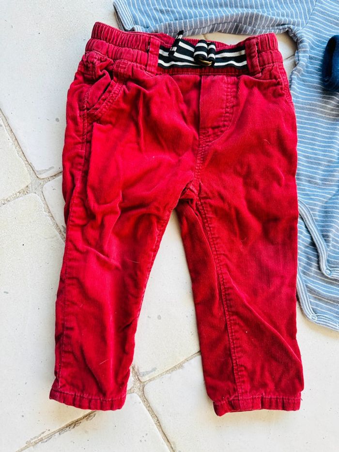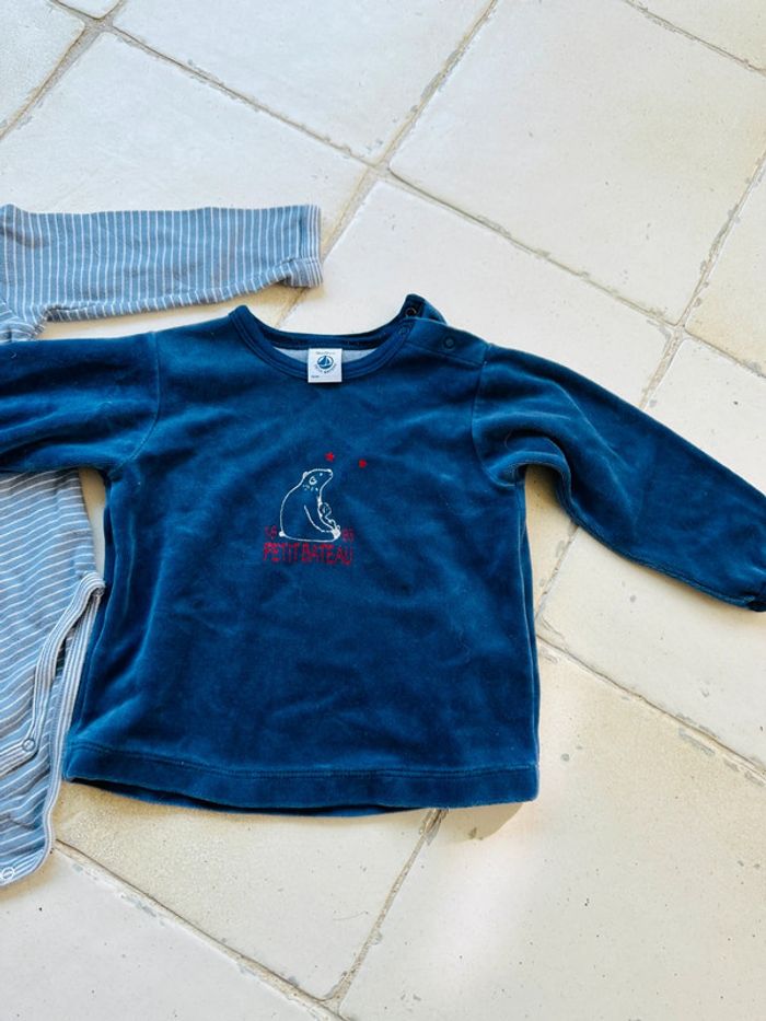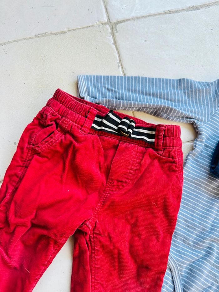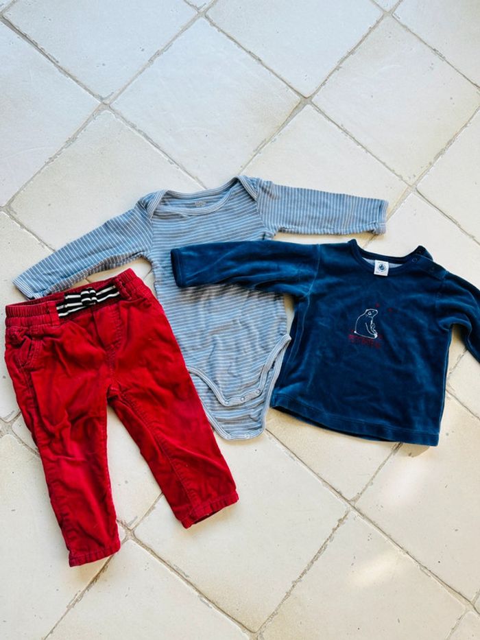 Lot de 3 articles taille 18 mois 1 body bleu clair / gris à rayures blanches en coton marque Bout’chou 1 pantalon rouge (pas aussi vif que sur les photos) marque Catimini en coton 1 pull bleu marine marque Petit bateau Très bon état du lot