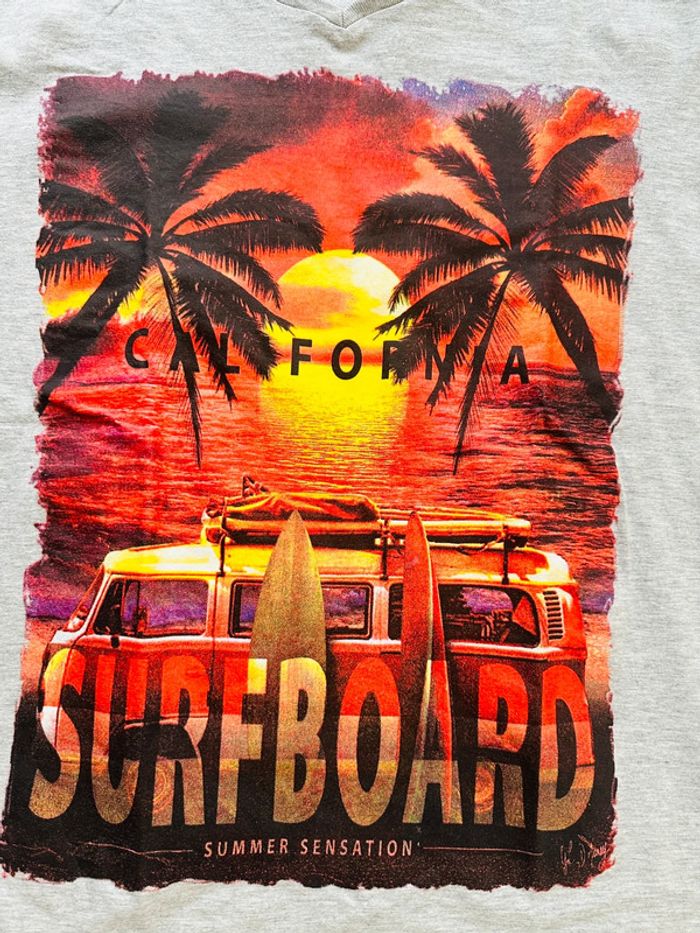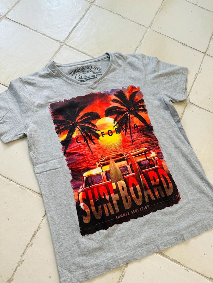 T-shirt manches courtes gris + motifs imprimés Marque : Your Paradise Beach Taille M Très bon état