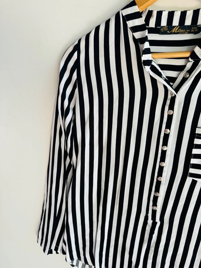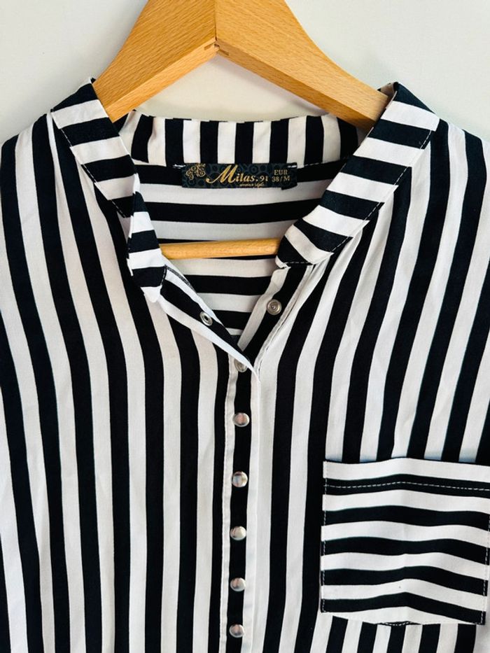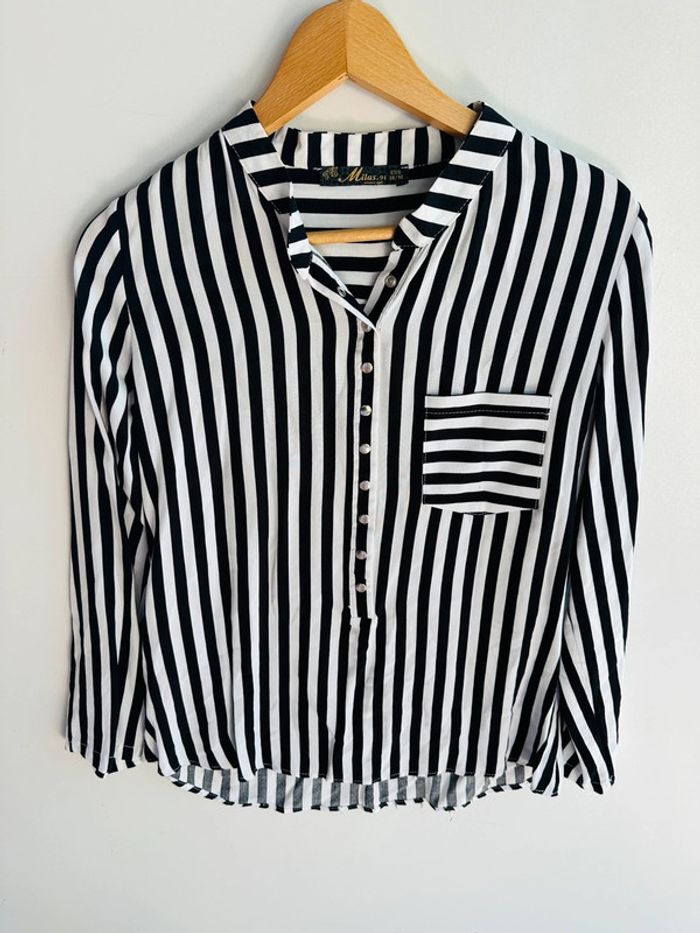 Chemise manches longue À rayures noires et blanches Marque Milas.91 Taille 38 / M Très bon état 100% viscose ‼️Pas d’envoi en Vinted go merci ‼️