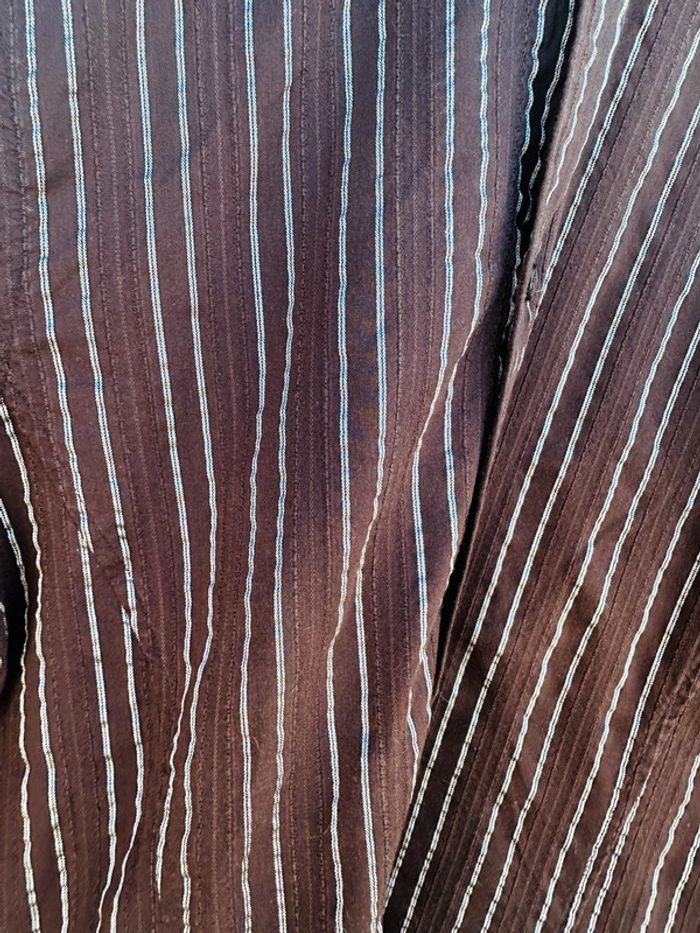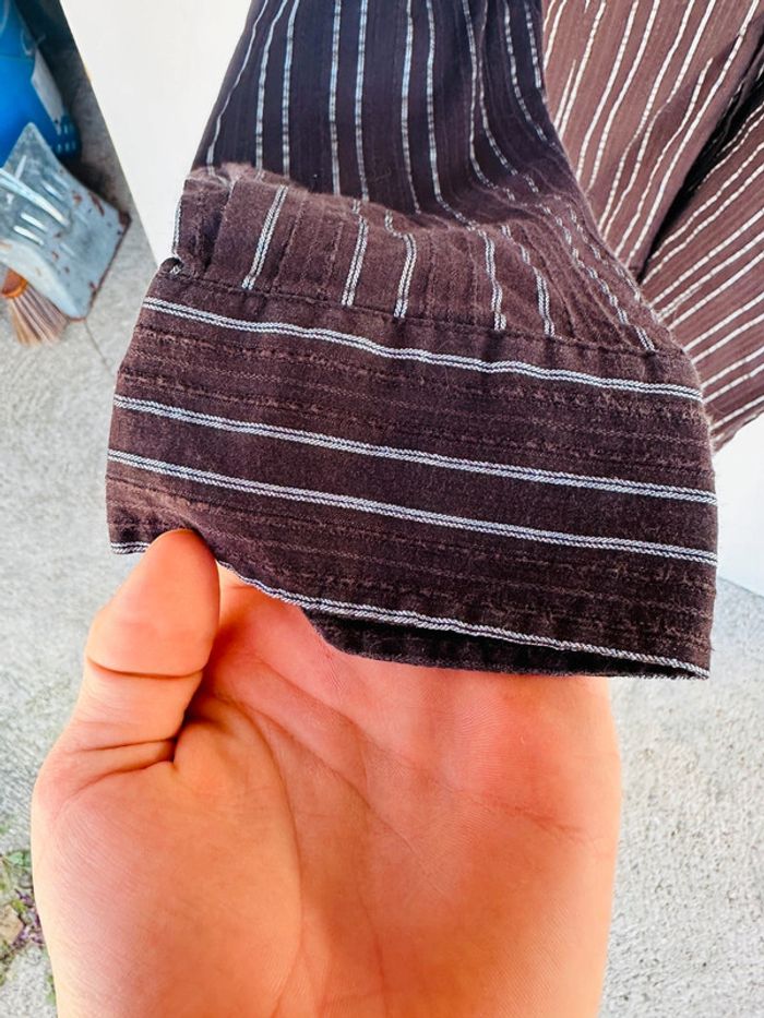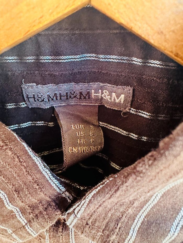 Chemise marron à rayures bleues argenté (ne ressort pas bien sur la photo) Marque H&M Taille S Très bon état 74 % coton, 17 % nylon 7 % polyester 2 % elasthane