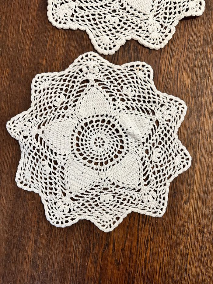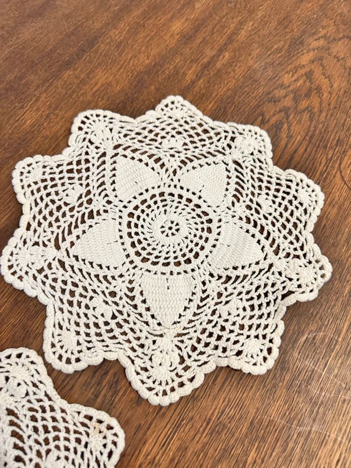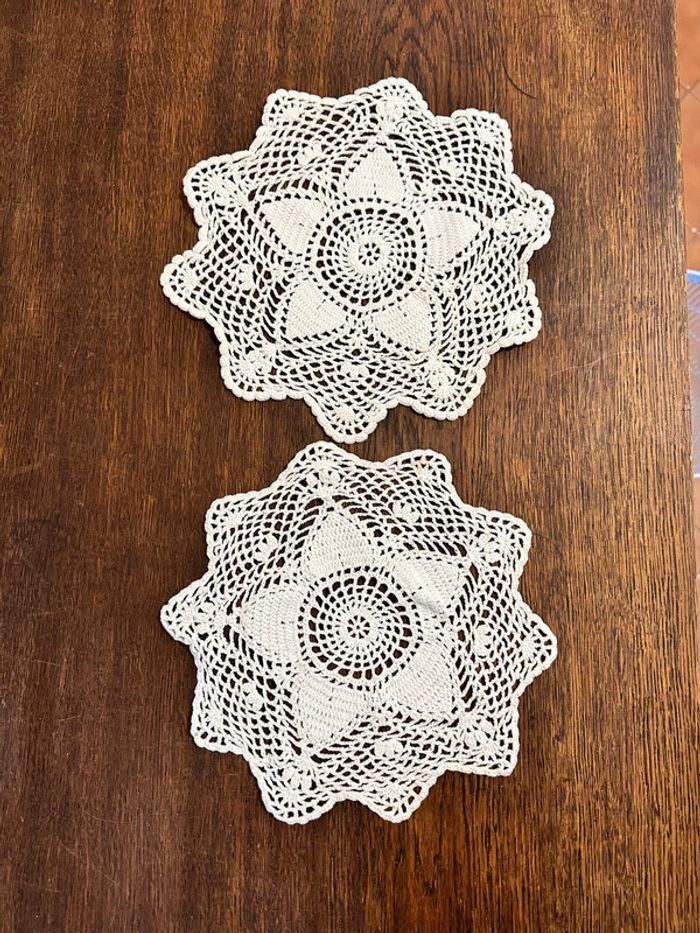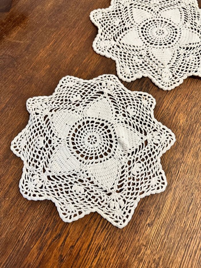 Lot de 2 napperons Blanc cassé L’un fait 25 cm de diamètre L’autre 26 cm de diamètre Très bon état