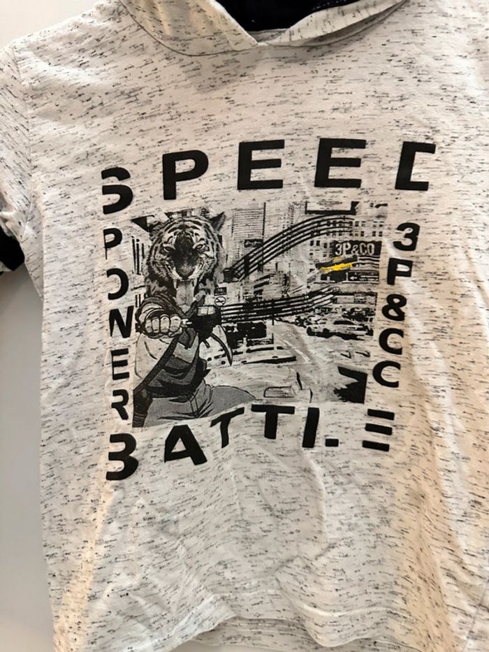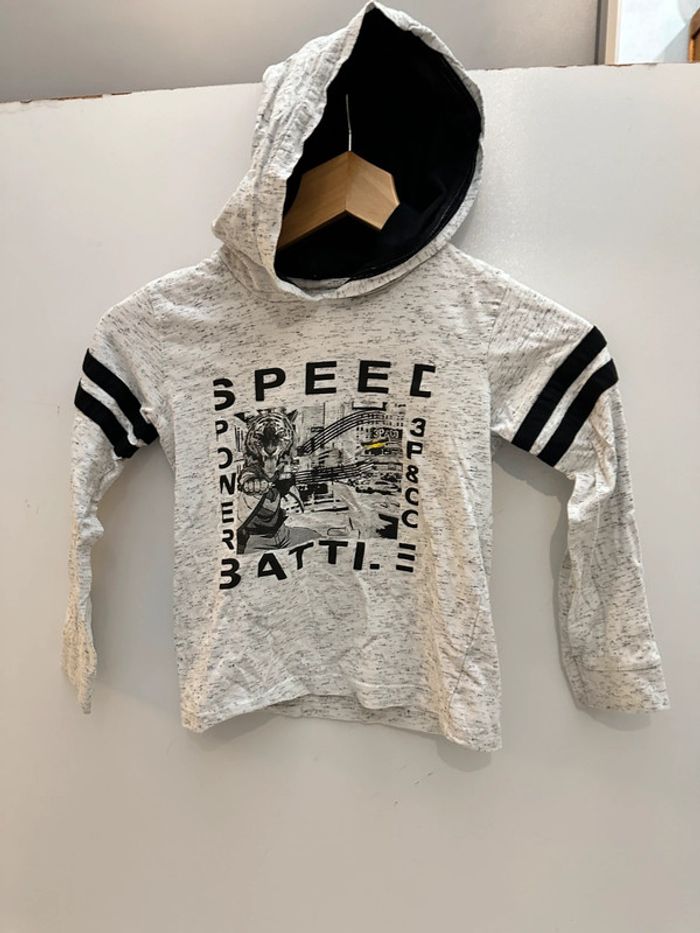 Pull gris avec capuche Taille 7/8 ans Très bon état 87% coton et 11,8% polyester et 1.1% viscose