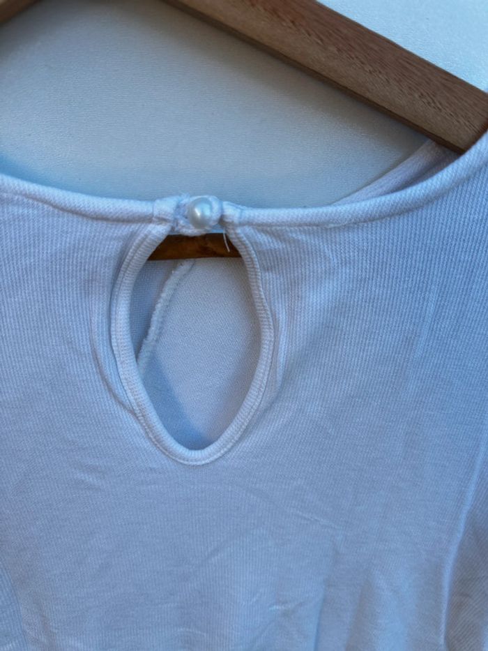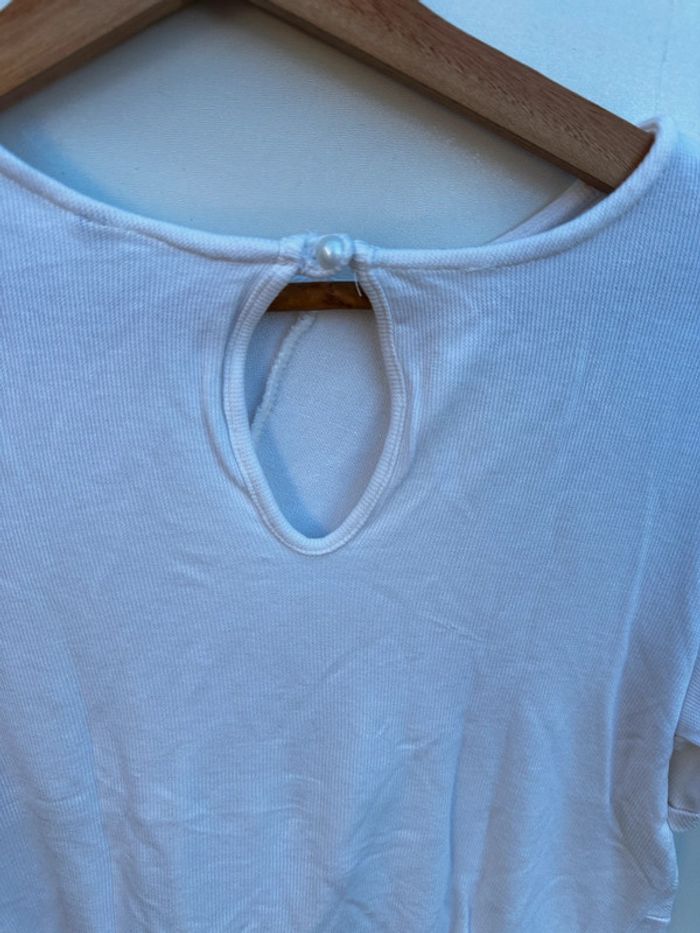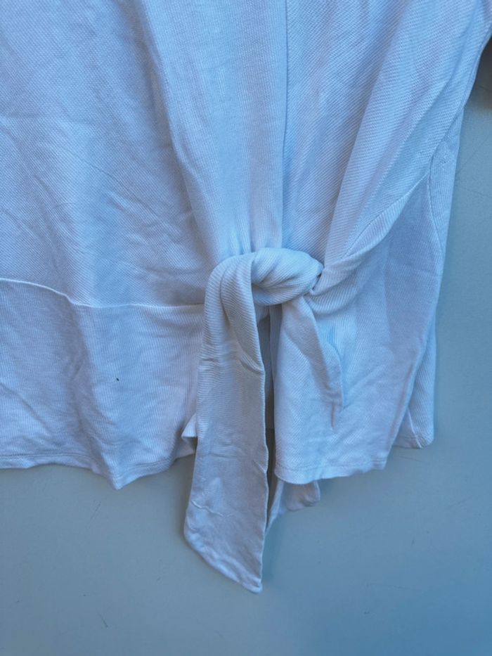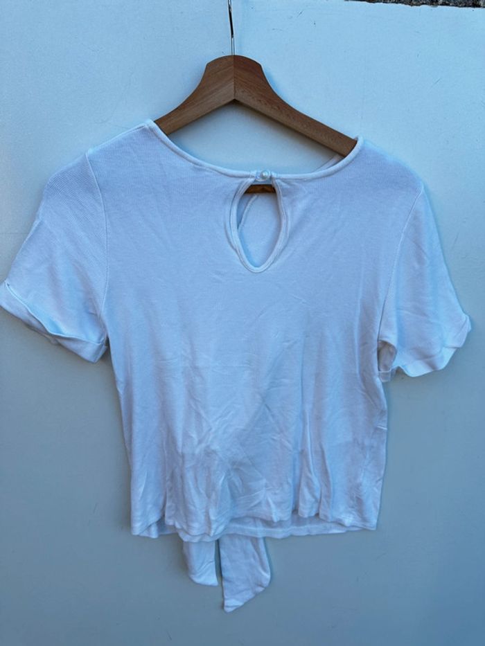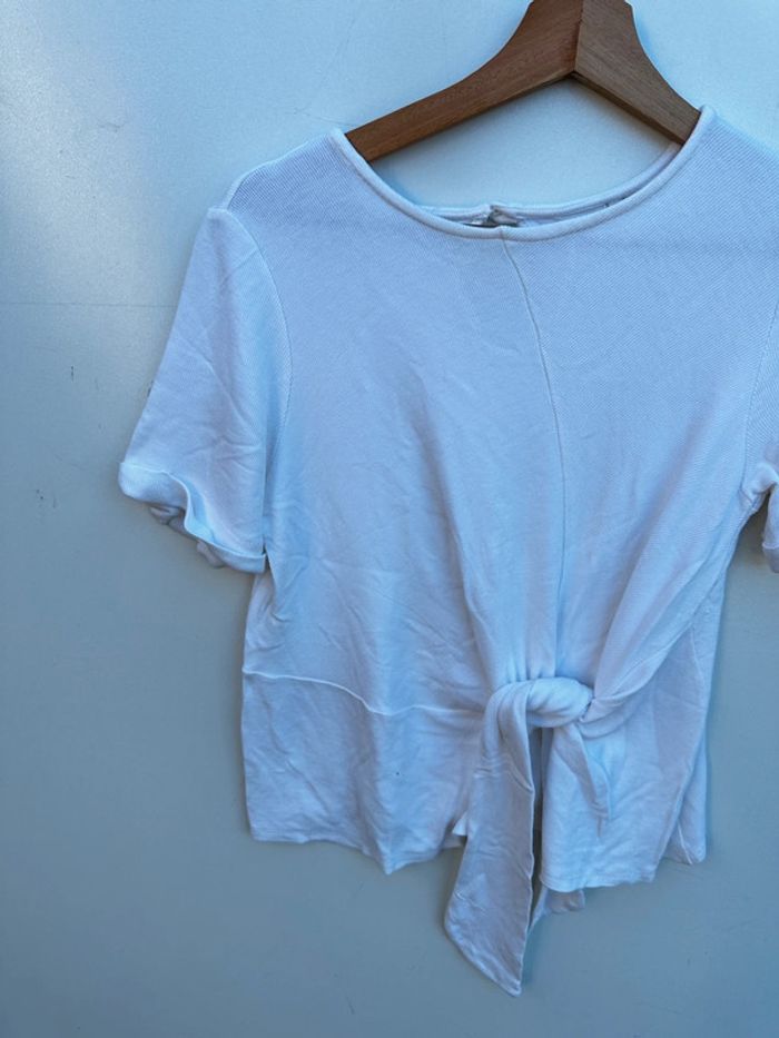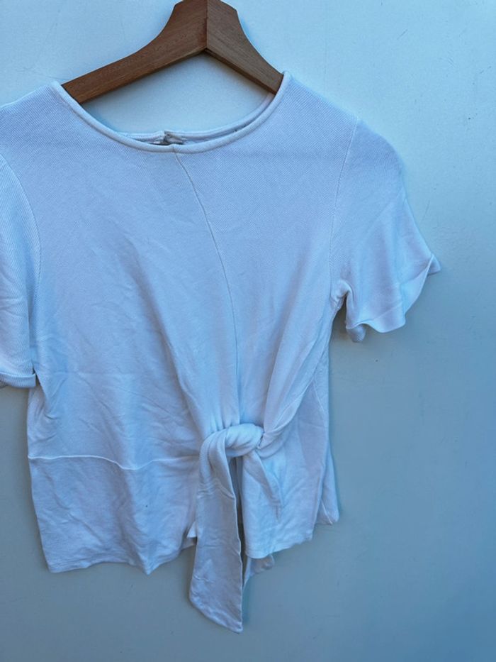 T-shirt manches courtes Blanc Avec noeud devant à nouer Ajouré dans le cou ferme par un petit bouton 95 % viscose et 5 % élasthane Taille 40