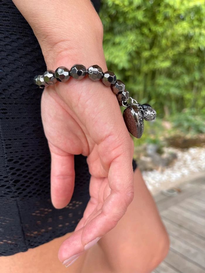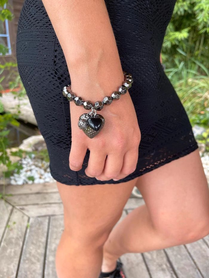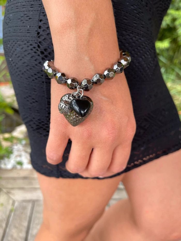 Bracelet élastique avec motifs cœur couleur noir argenté