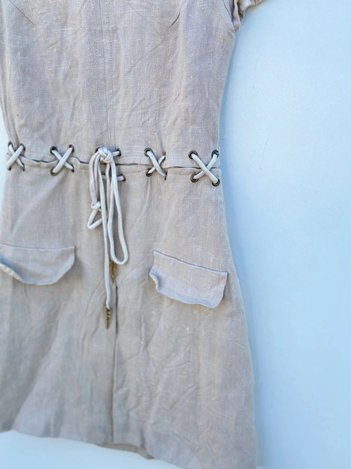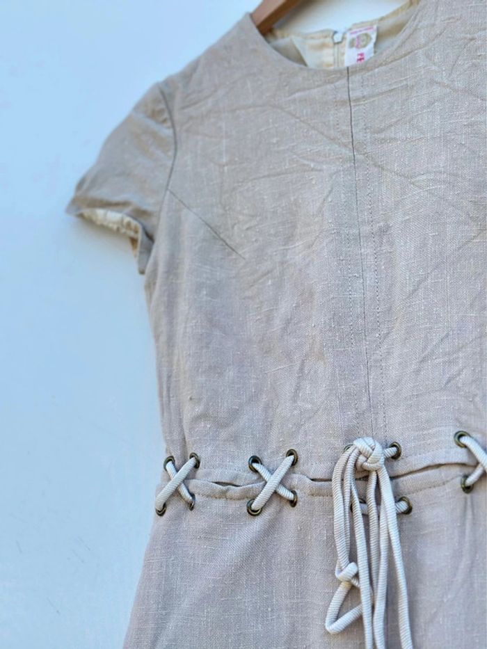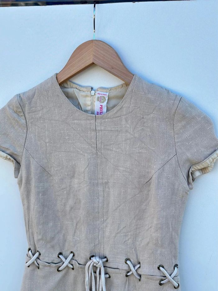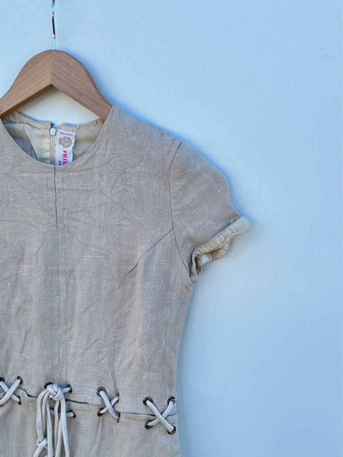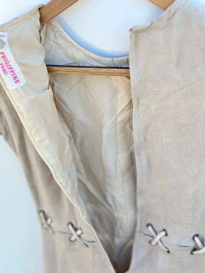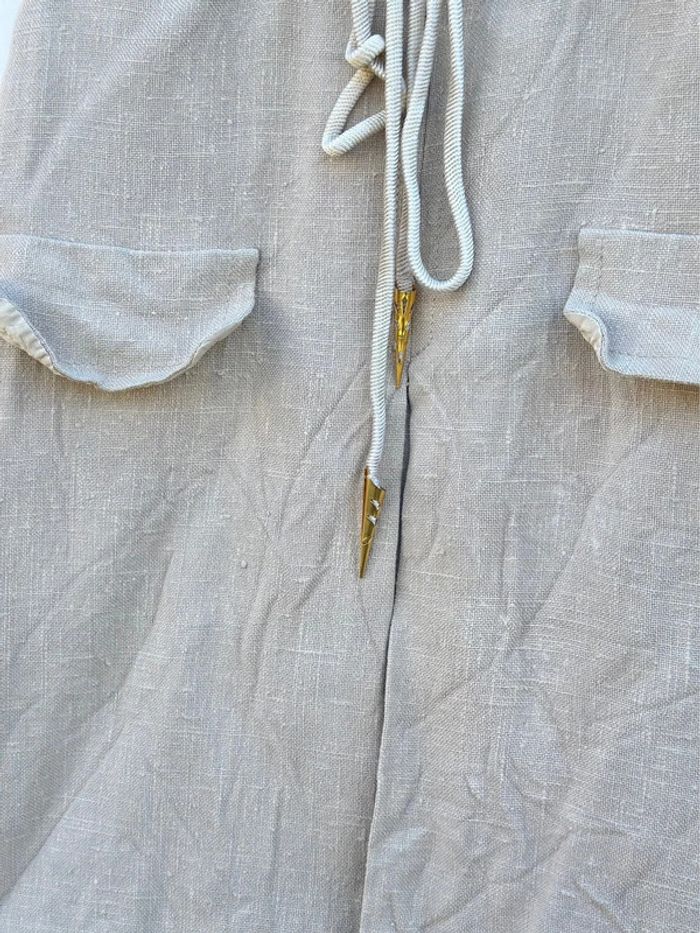 Robe en lin Taille 36 Marque : Philippine Paris Fermeture éclair au dos Made in France 🇫🇷 Cordons fantaisie tout autour Petites manchettes Ouverture devant milieu Fausses poches en bas ( gauche et droite )