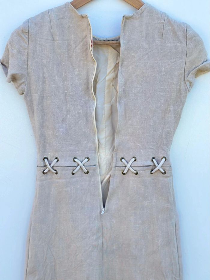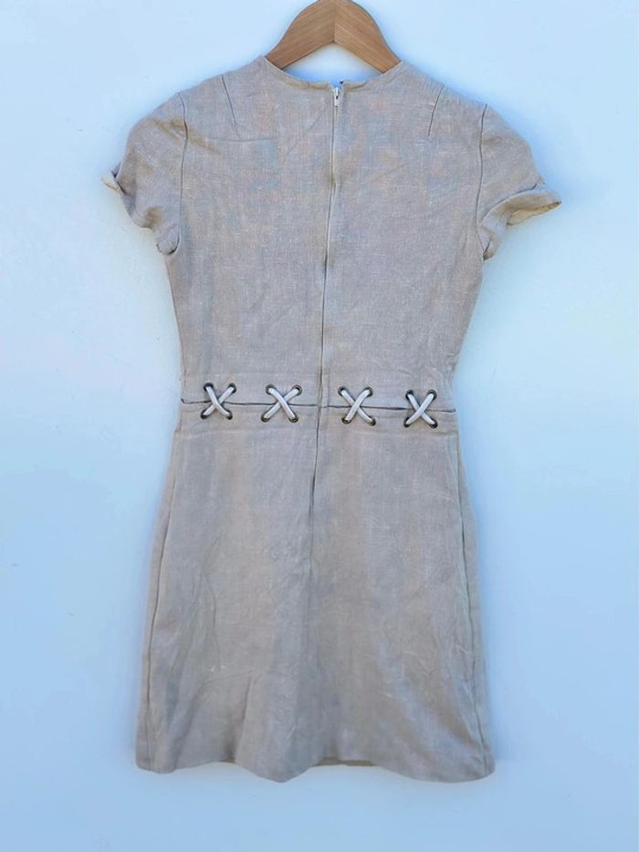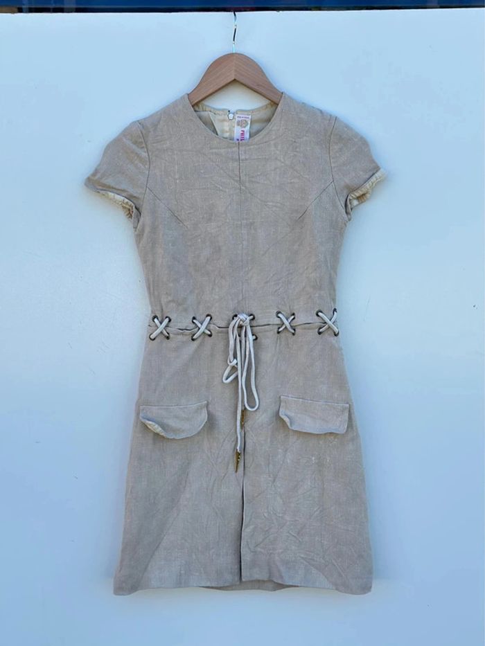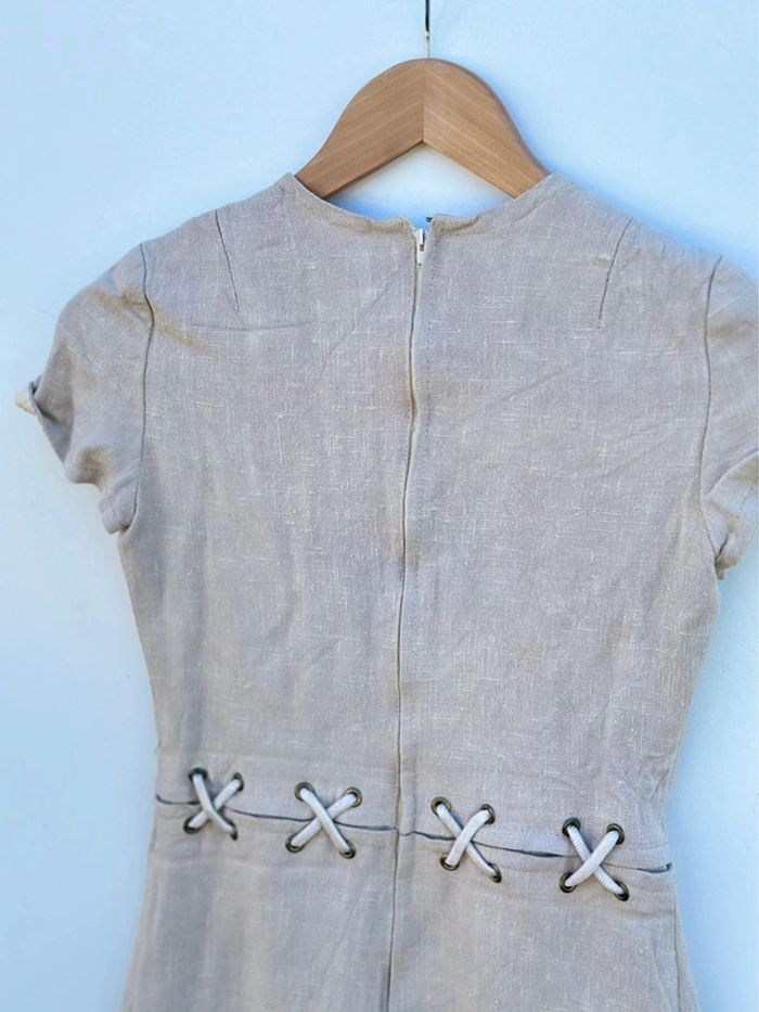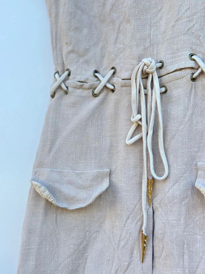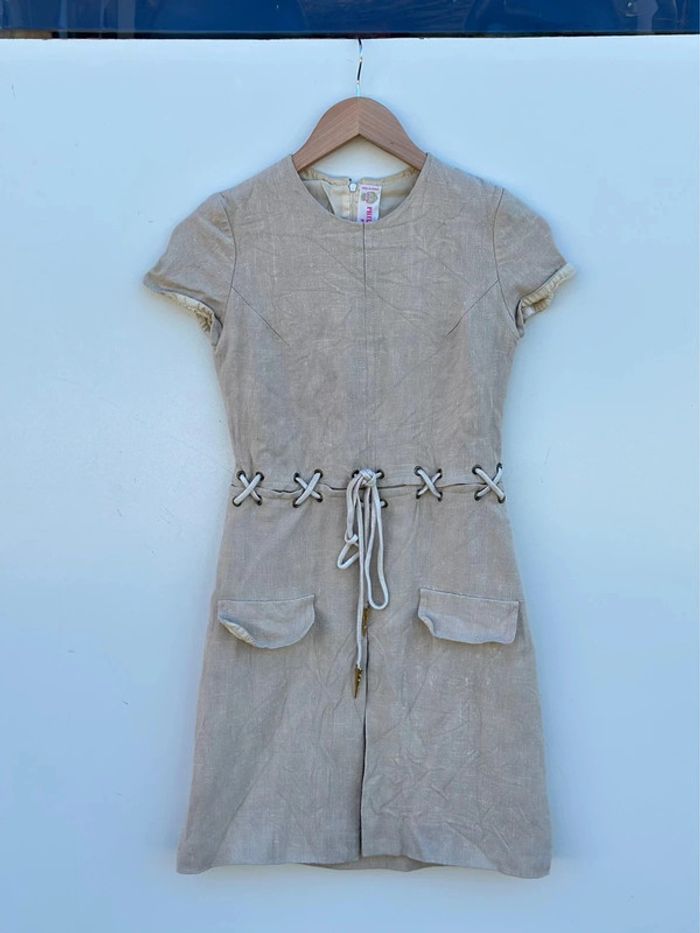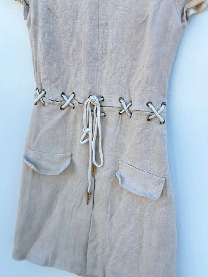 Robe en lin Taille 36 Marque : Philippine Paris Fermeture éclair au dos Made in France 🇫🇷 Cordons fantaisie tout autour Petites manchettes Ouverture devant milieu Fausses poches en bas ( gauche et droite )