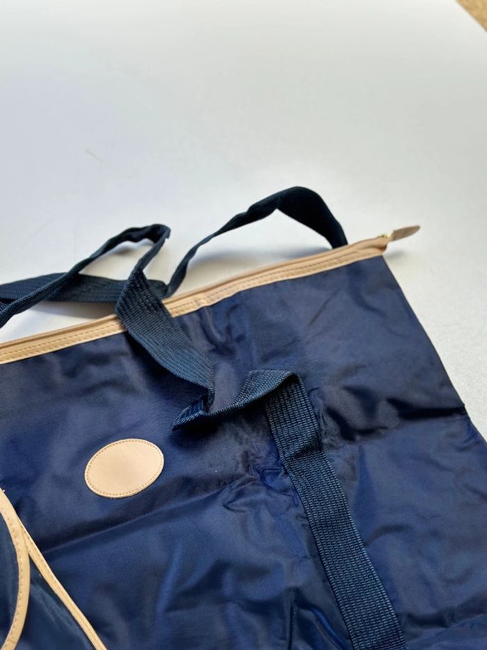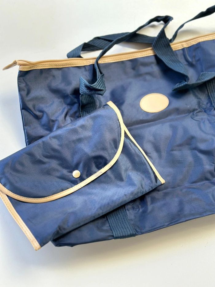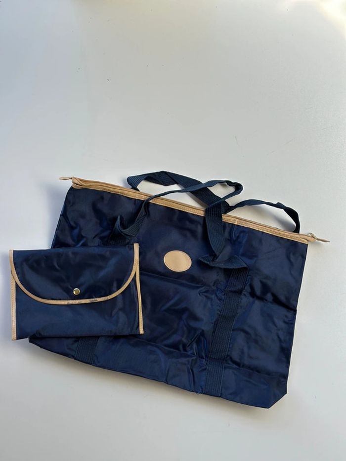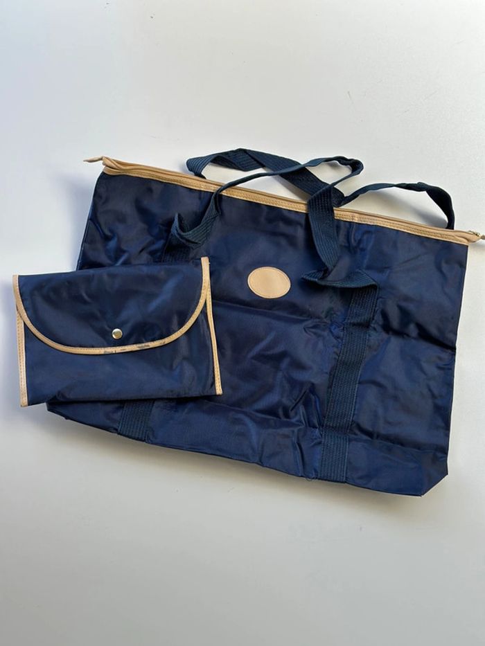 Sac de voyage + pochette La pochette qui sert à ranger le sac se clipse et sert de pochette intérieur ( pochette légèrement abîmé sur le devant ) Dimensions : Longueur : 58 cm Largeur : 40 cm