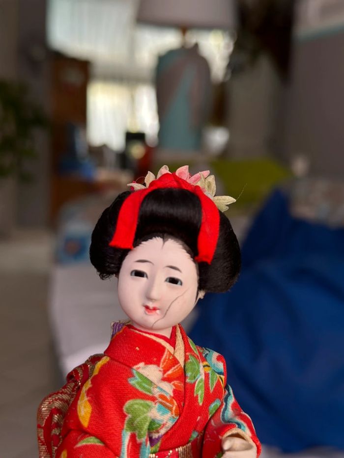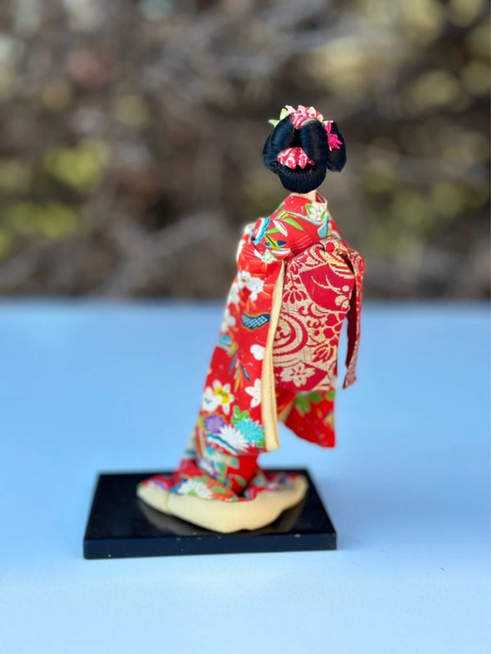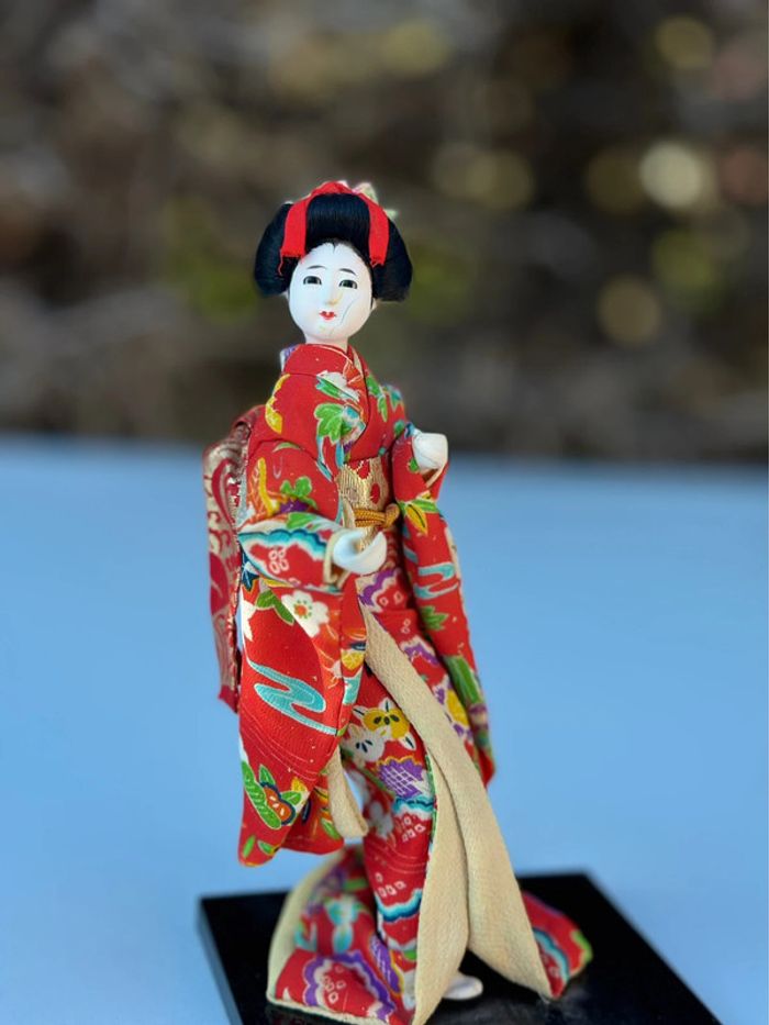 Poupée japonaise sur socle Tenue traditionnelle Tête fissuré (voir dernière photo) Hauteur avec socle : 21 cm Longueur socle : 12 cm Largeur socle : 9 cm