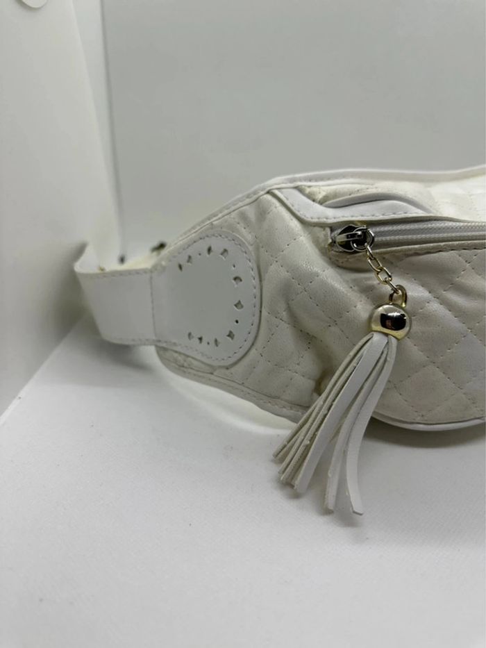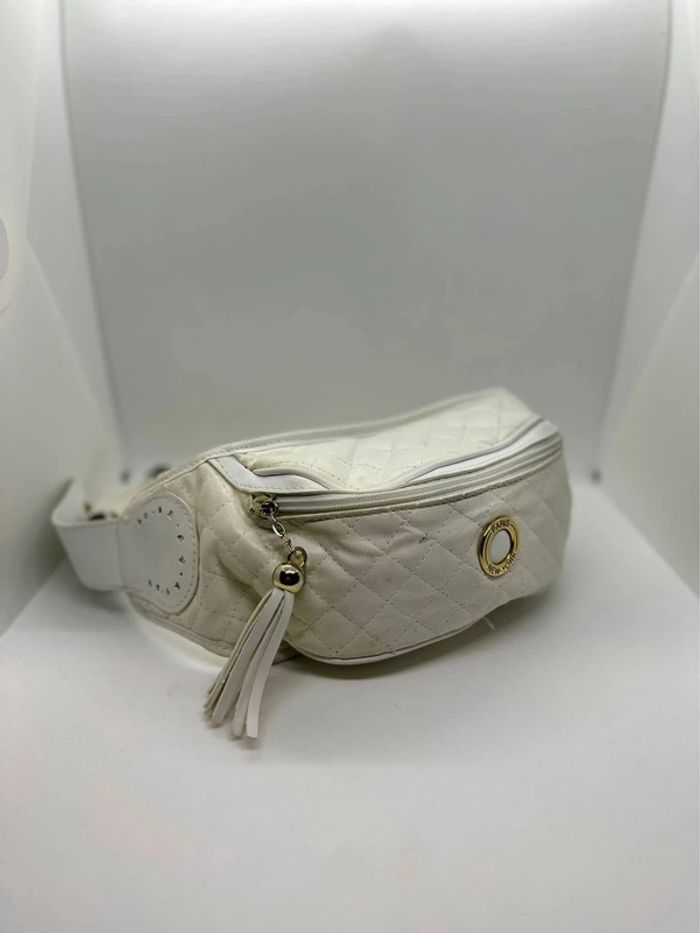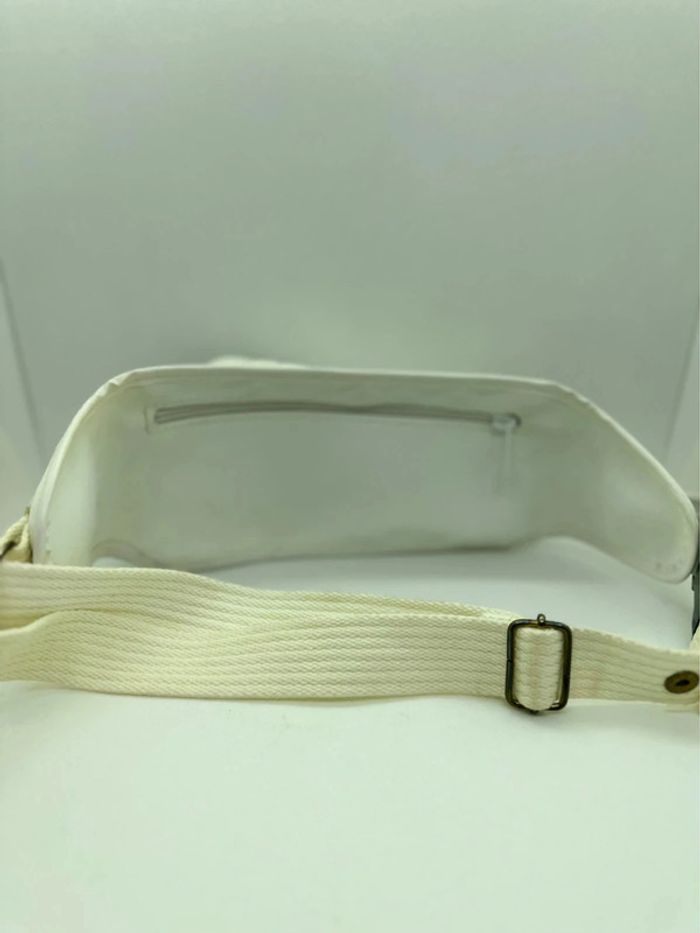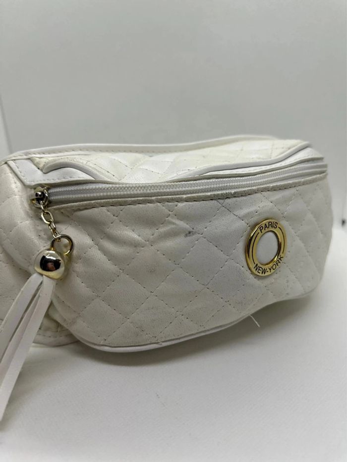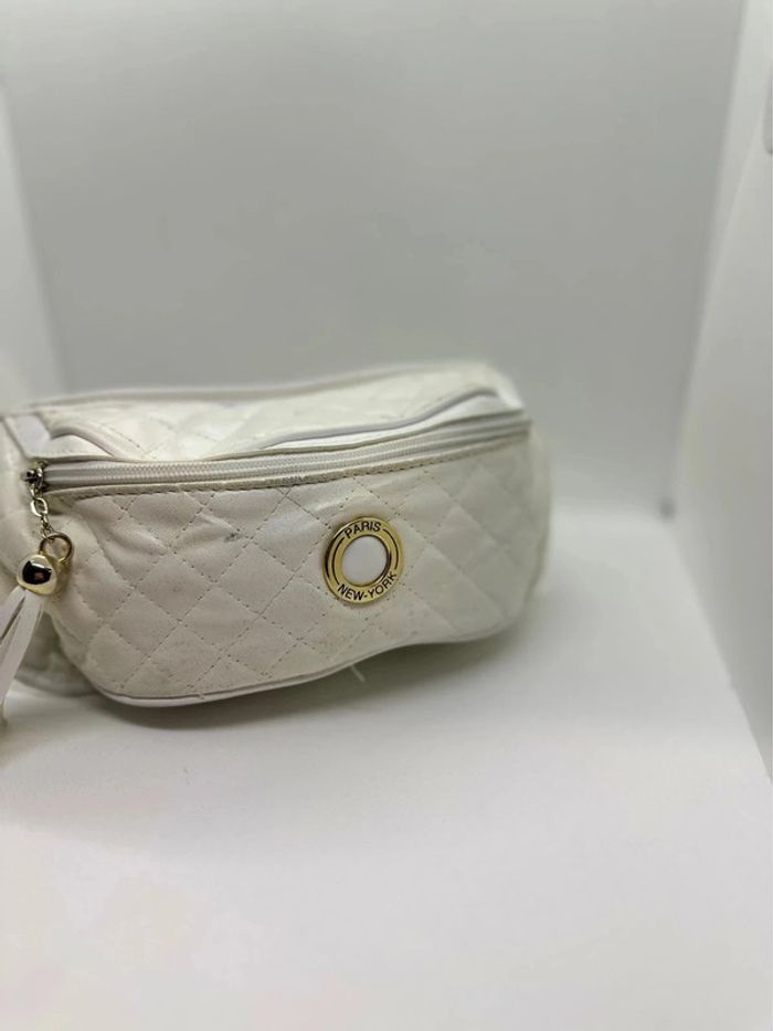 Sac banane blanc Une poche principale Une poche plaquée à l’arrière ( fermeture éclair ) Réglable à la taille Intérieur taches Quelques accros Mais il reste en bon état général