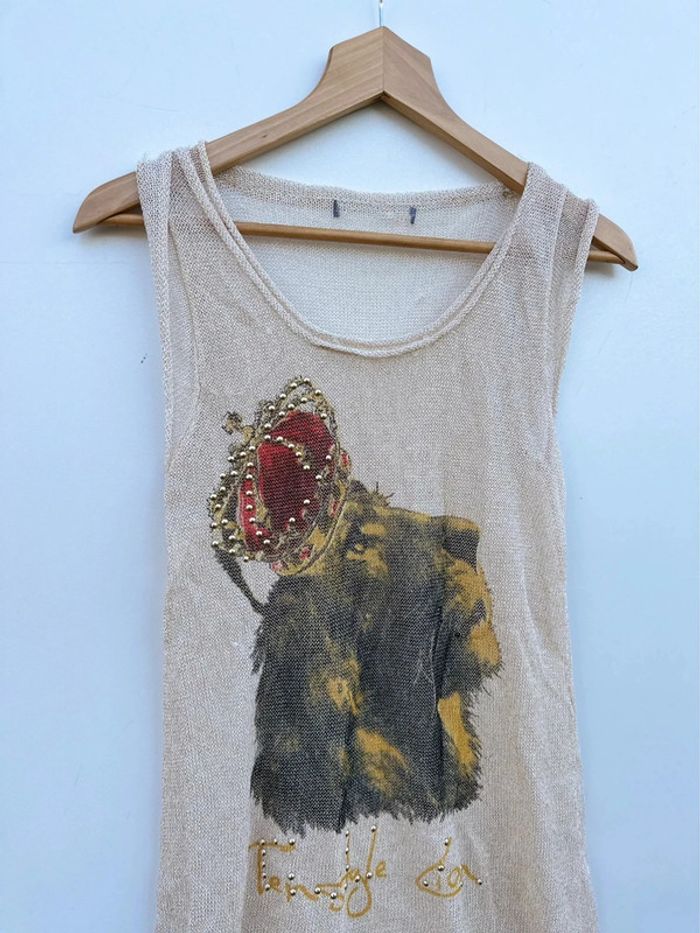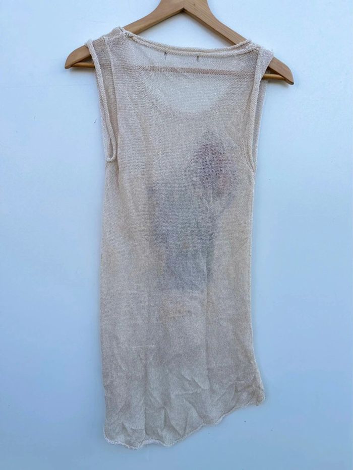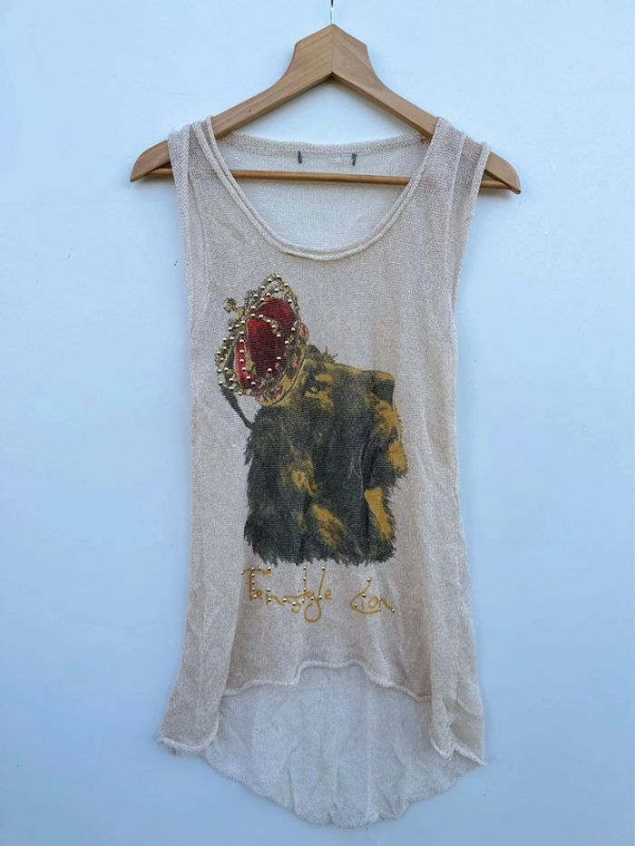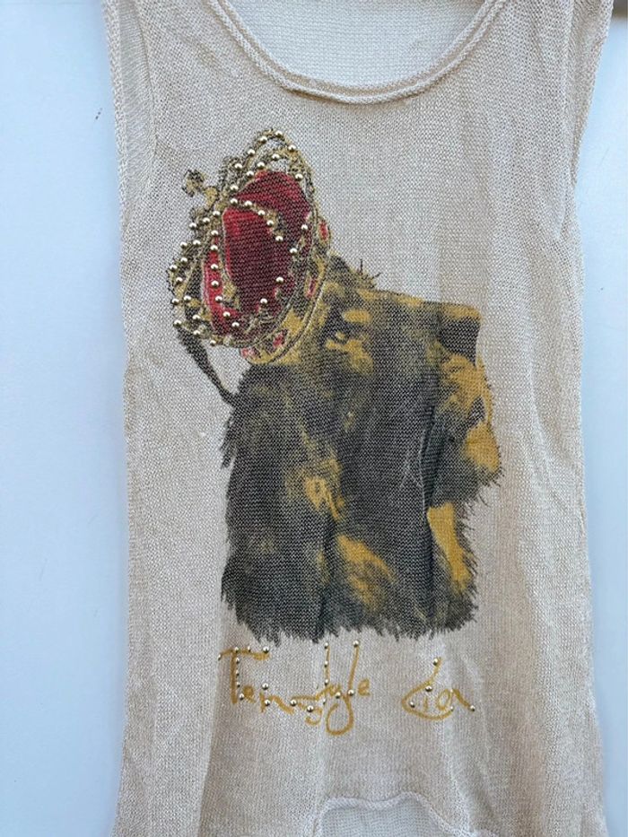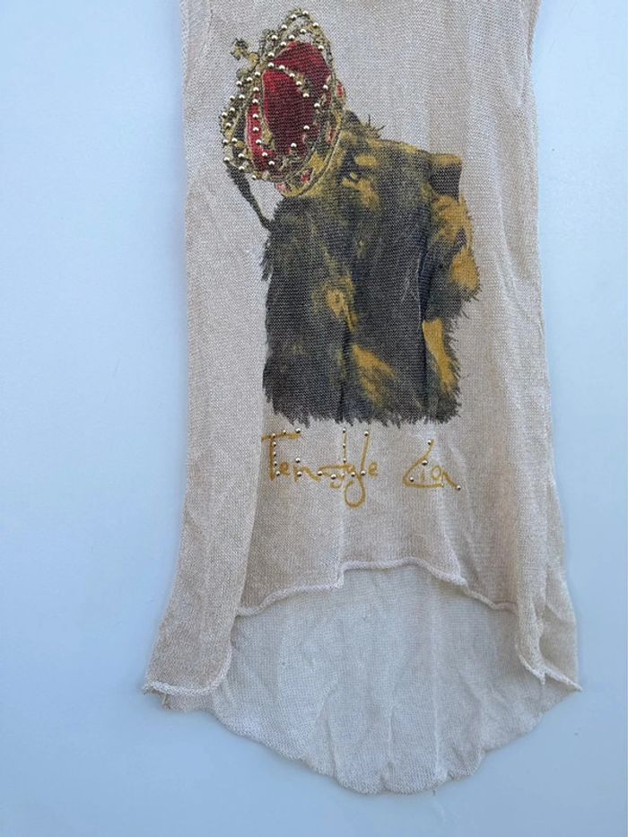 Tunique dans les tons beige et doré Matière filée et extensible Manches courtes Quelques fils de tirés Motif lion Taille unique Le derrière est plus long que le devant Bon état