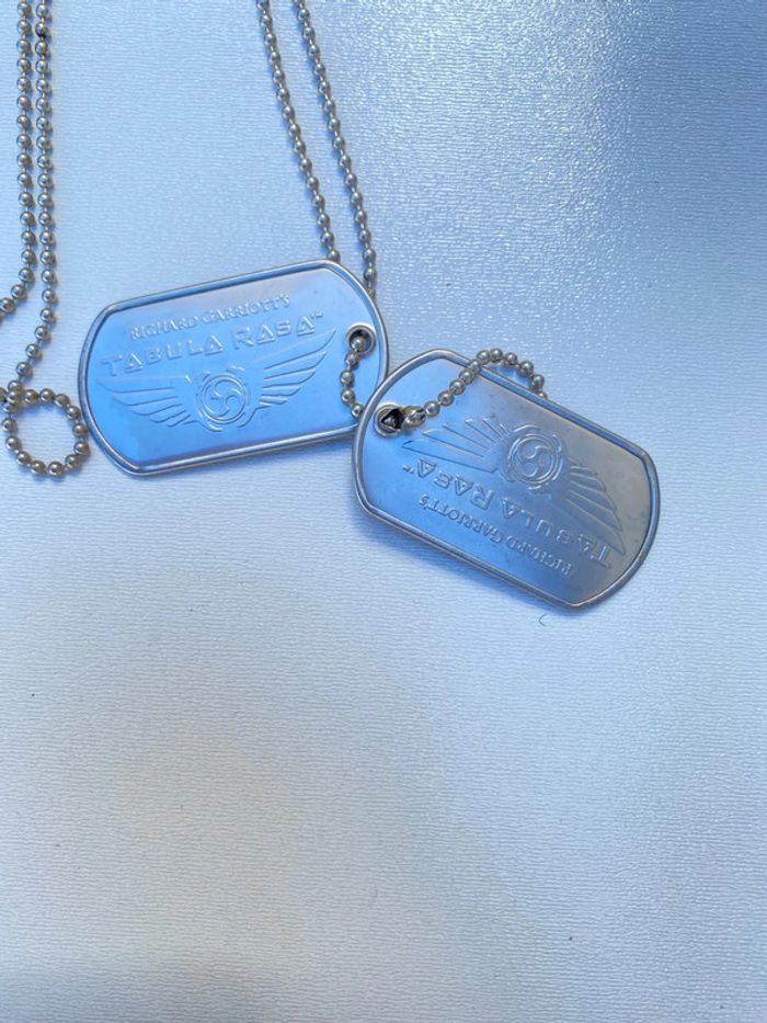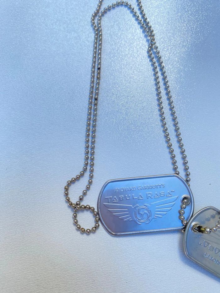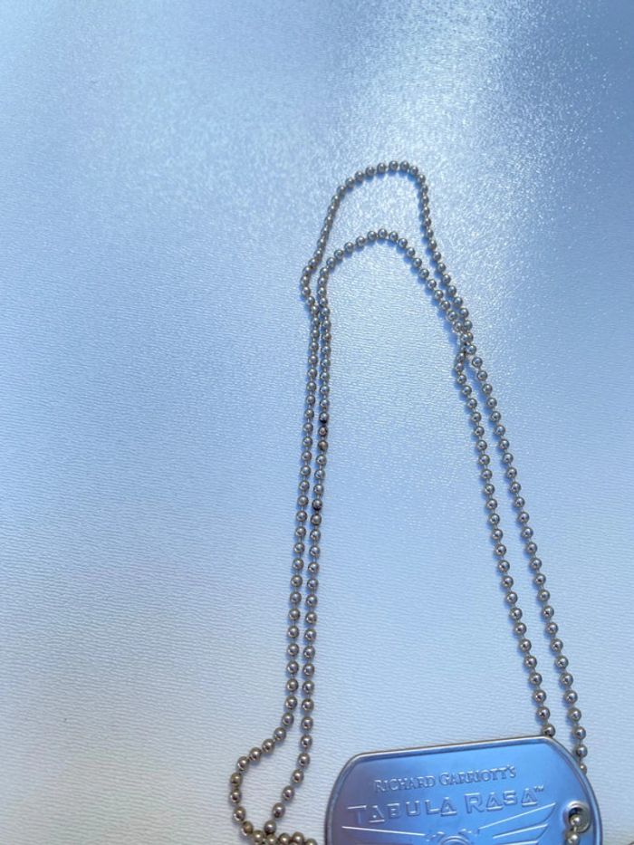Chaîne couleur argent avec 2 plaques Gravé " RICHARD GARRIOTT’S TABULA RASA " Très bon état