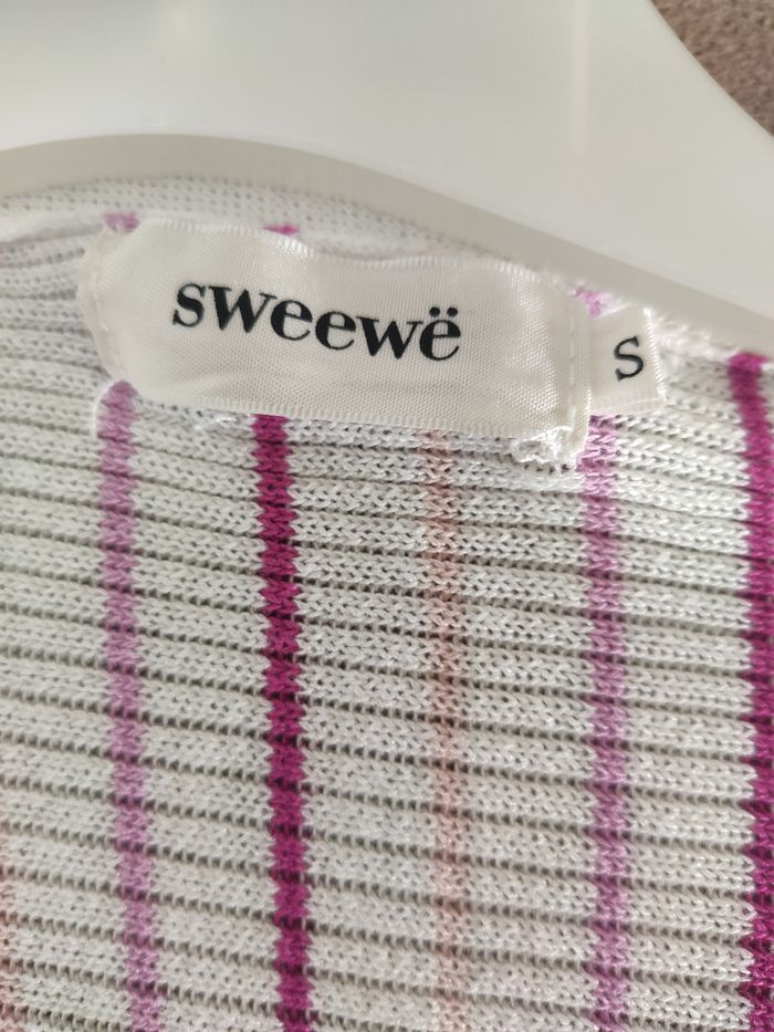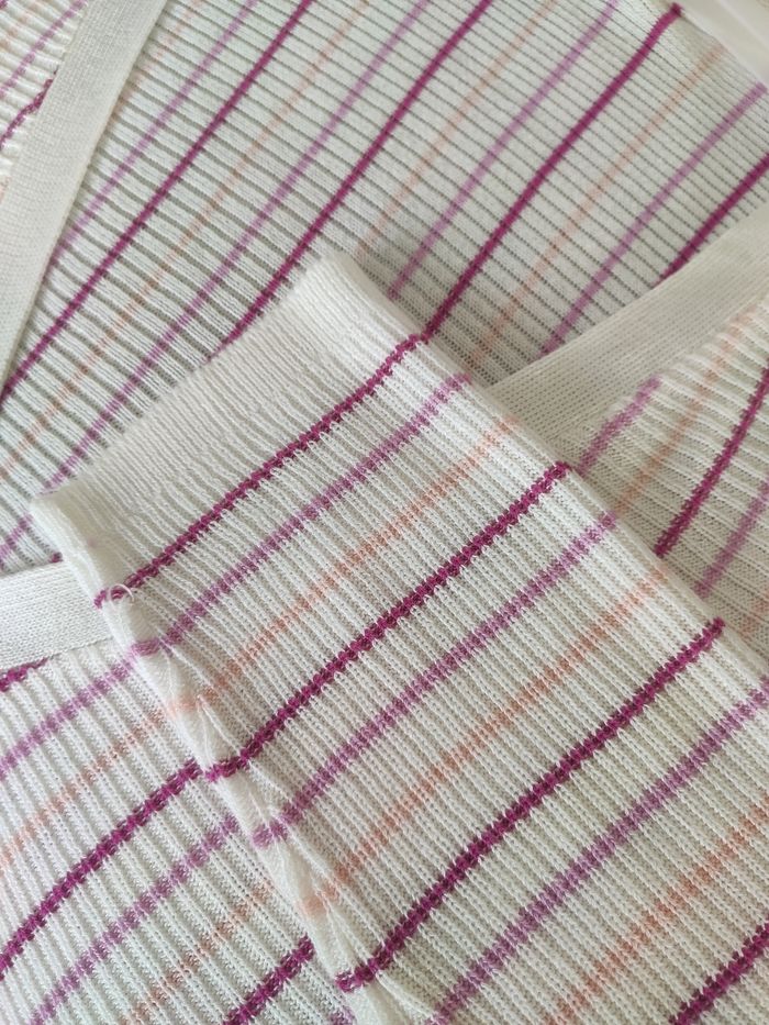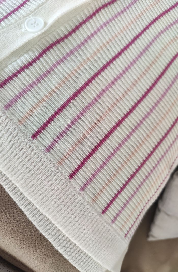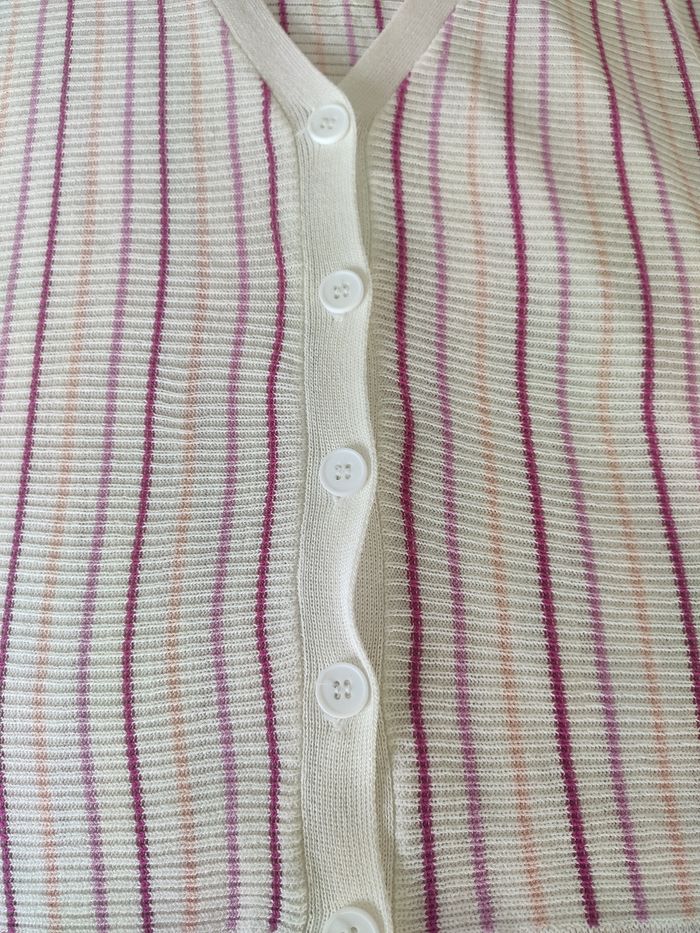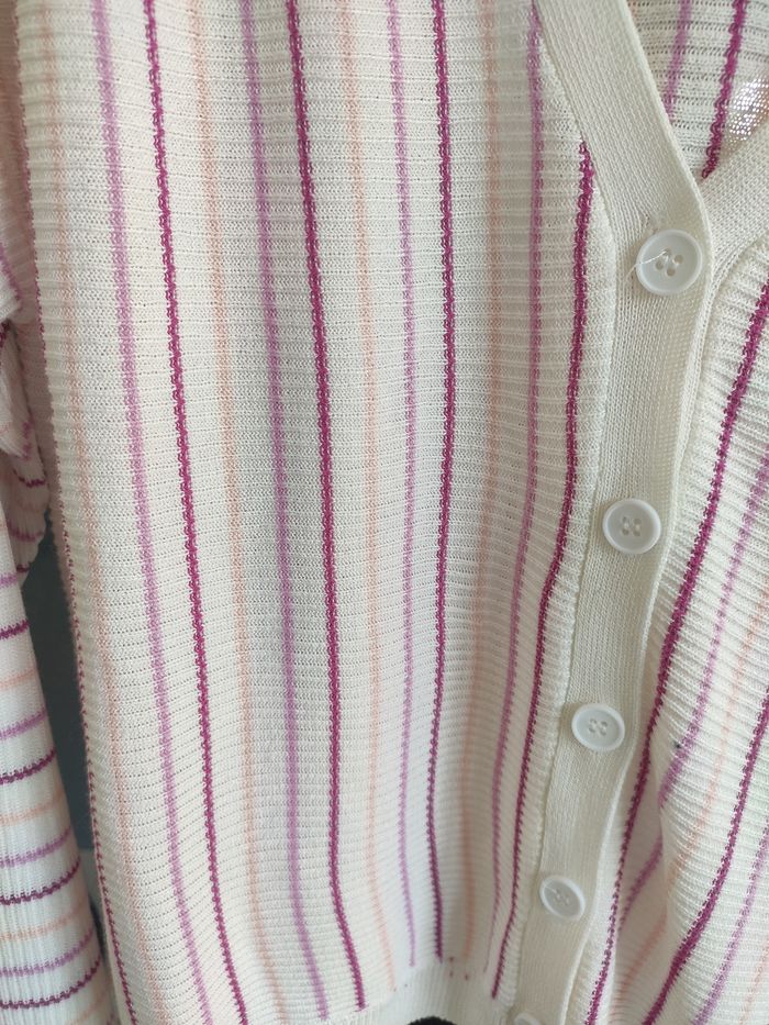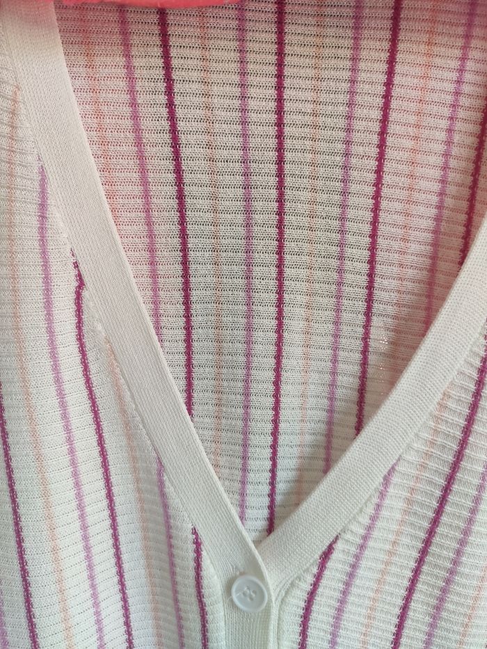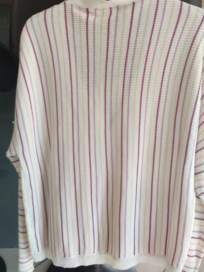 Gilet en viscose à rayures 3 couleurs sur fond blanc Taille S.(36-38) Mesures : épaule à épaule : 52 cm Manches : 53 cm Longueur : 60 cm.