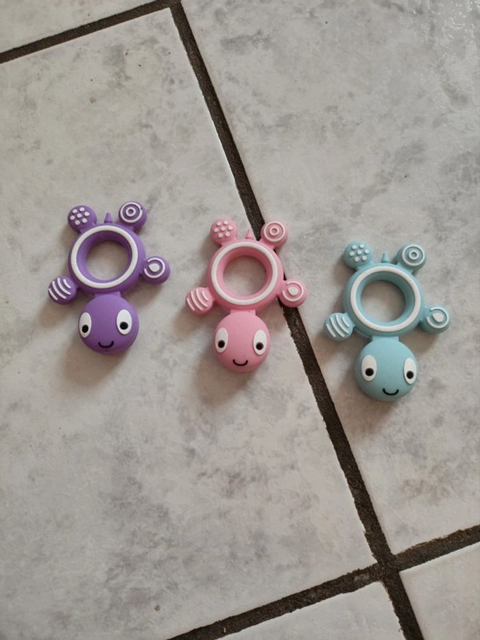 Vends ce lot de 4 anneaux de dentition en silicone, motif tortue. Neufs. Ventes possible à l'unité : - anneau seul : 2€ Pour création... Possibilité de constituer un lot avec d'autres annonces, n'hésitez pas à me contacter.