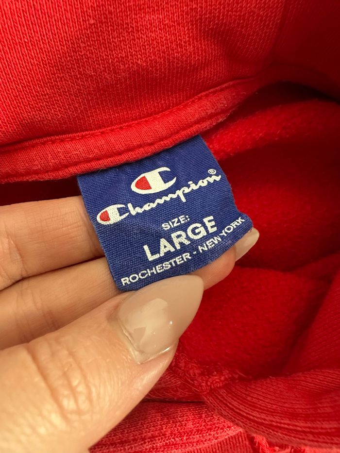 Sweatshirt - Excellent état - Taille 40 équivalent L Dimensions en bas de l’annonce - Marque Champion - Vintage, années 80’ - Rouge et bleu marine - Intérieure polaire - Logo tout le long des manches - Capuche et cordon pour l’ajuster - Modèle unisexe - 100% Coton Dimensions: - 62cm niveau aisselles - 60cm de long