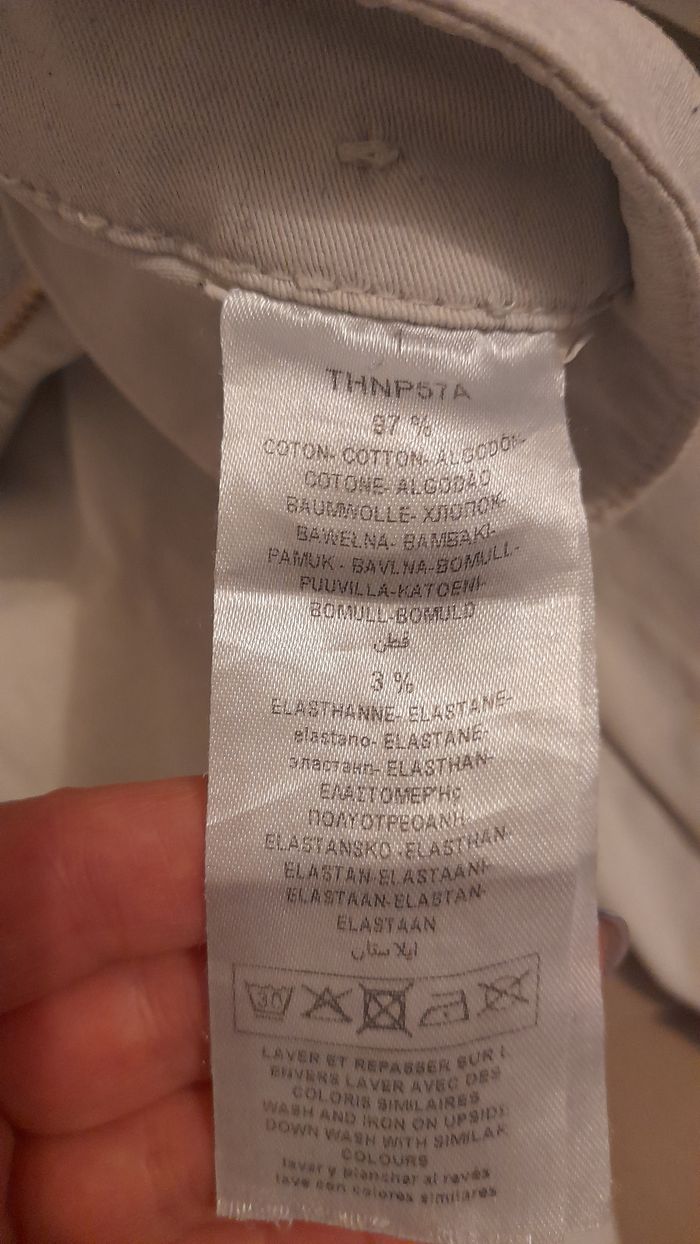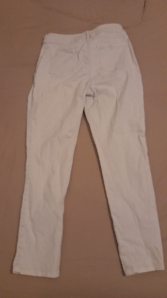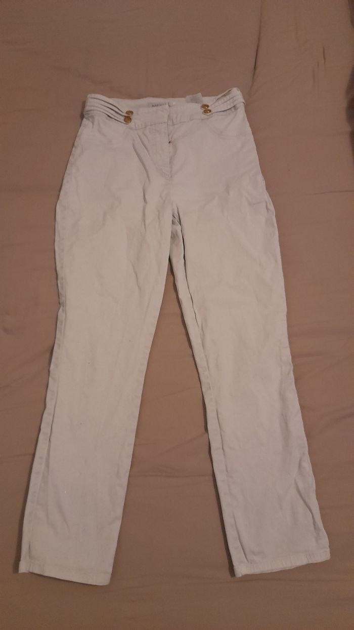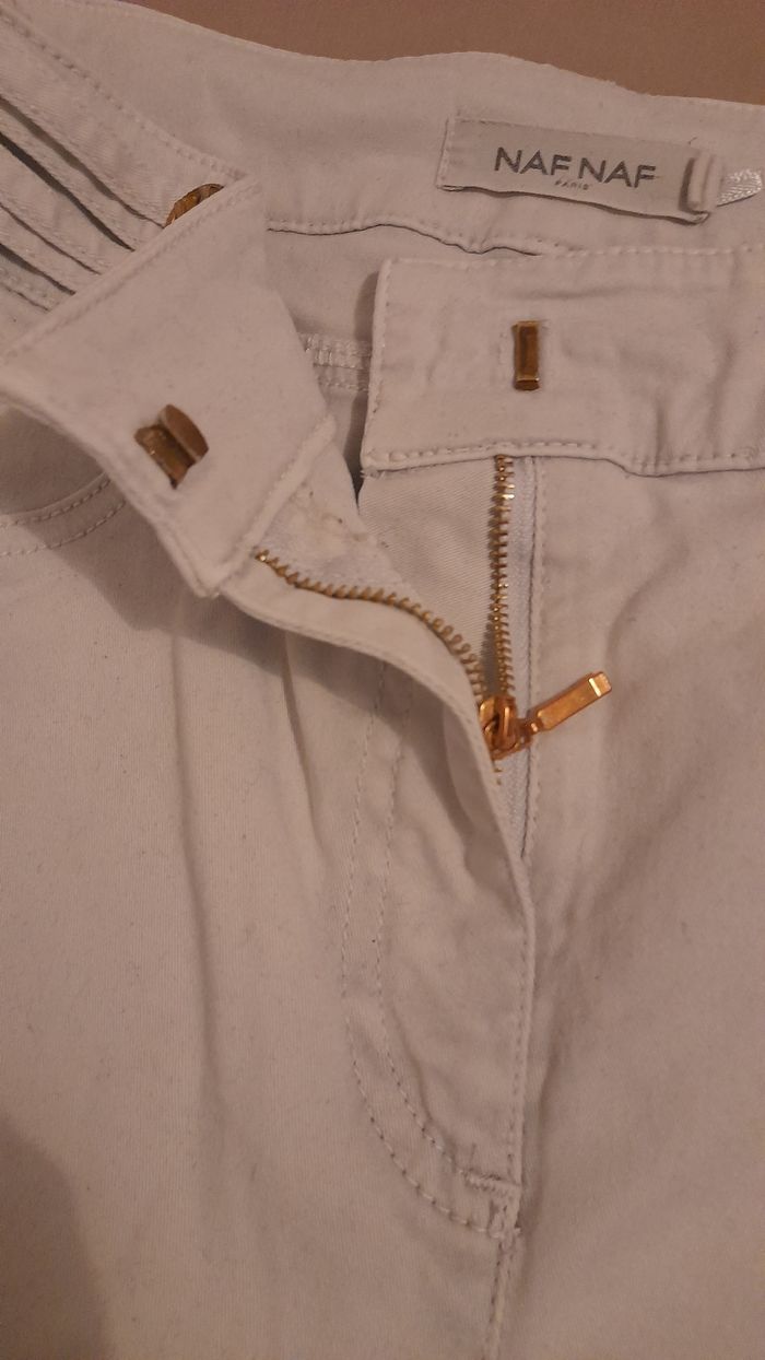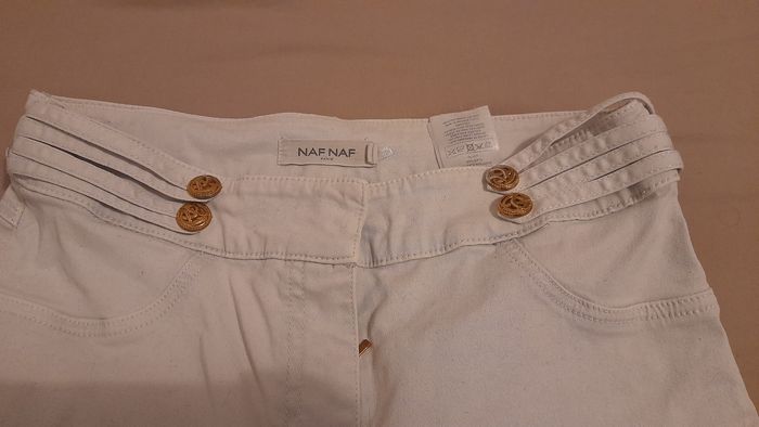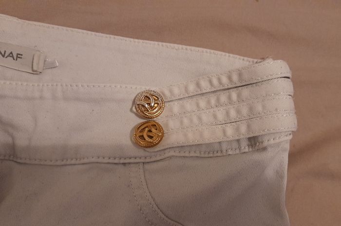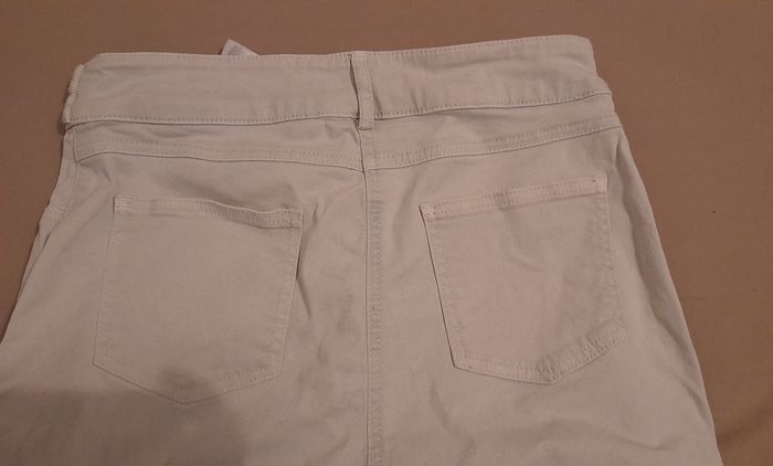 Pantalon droit blanc Style jeans Fermeture éclair et accroches Passant ceinture Fausses poches devant Boutons décoratifs sur les hanches 2 poches derrière