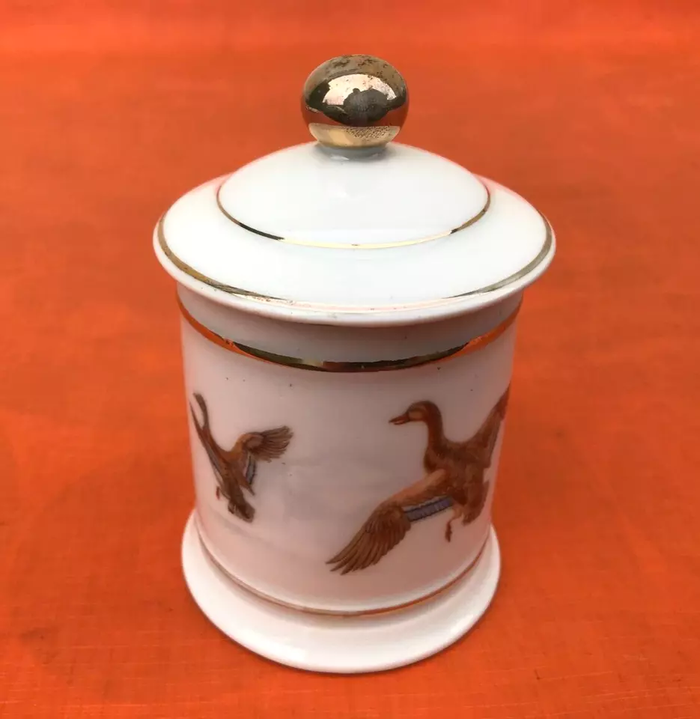 Pot couvert à décor de canards Porcelaine d' Art de Limoges France Hauteur : 115mm Diamètre : 80mm Poids : 220grs