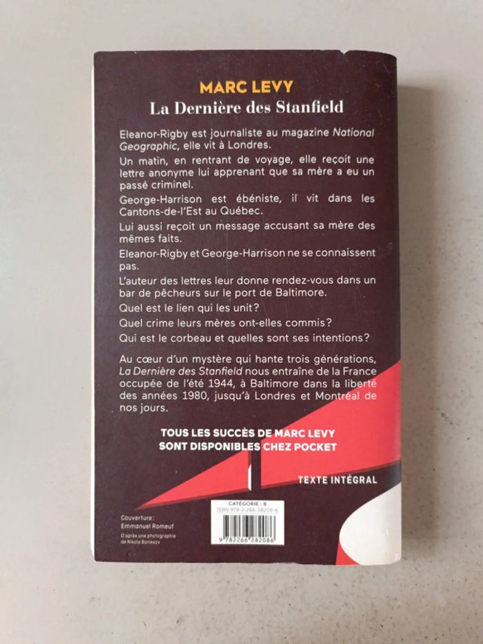 Marc Levy la dernière des Stanfield. Voici le lien pour voir tous mes livres : #romain75015_Livres et #romain75015_Marc_Levy. Envoi rapide et soigné bien protégé pour le transport. N'hésitez pas à faire un lot pour avoir des réductions et mutualiser les frais de port.