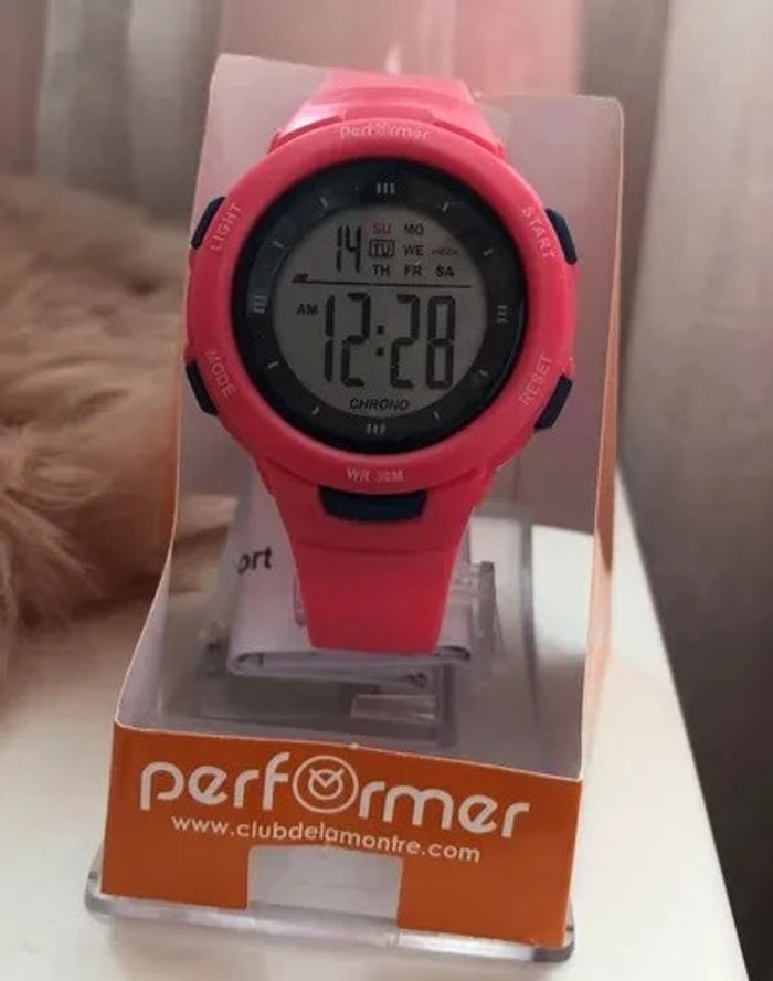 Montre Digitale Performer Femme Silicone Rose Multifonctions Neuve dans emballage Petite montre jolie jolie, pour la plage, la montagne et même le bureau ou l'école, elle s'adapte à toutes les circonstances, étanche à 50 mètres on peut même la prendre dans l'eau. Spécialement conçues dans des matériaux sélectionnés pour leur qualité, les montres Performer sont créées et distribuées par MGH, société horlogère française, experte dans la conception et la fabrication de montres toutes marques. Performer propose des montres pour Hommes classiques et traditionnelles à petit prix, robustes et précises