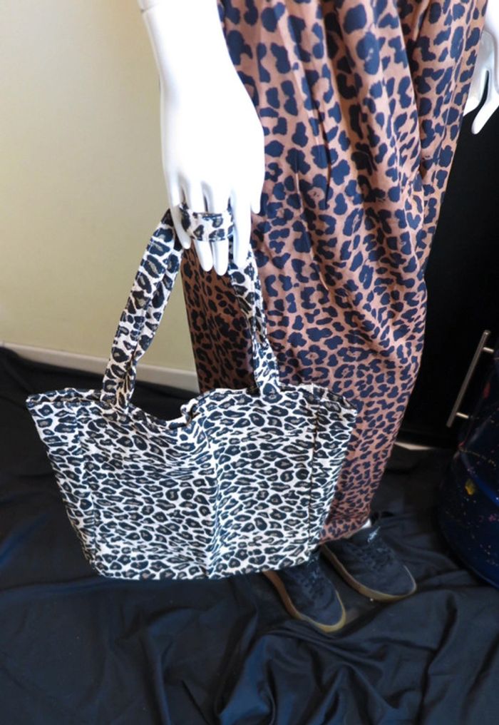 👜 Sac à main totebag fourre-tout sac de cours école courses cabas jacquard léopard 🐆 noir beige neuf - photo numéro 10