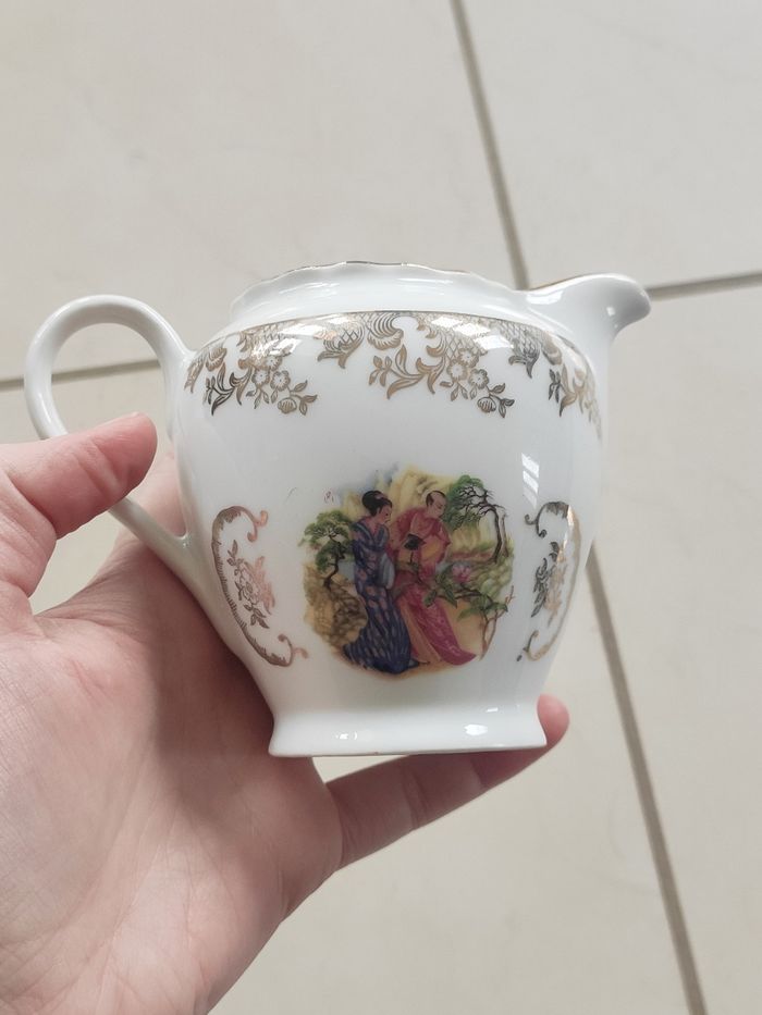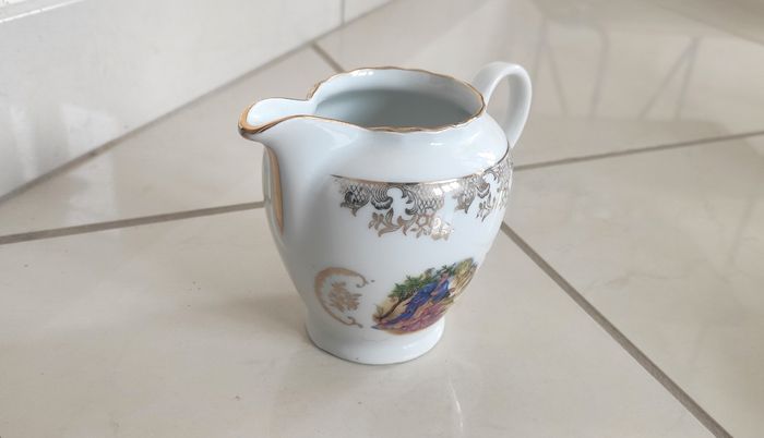 Jolie carafe en porcelaine peinte. Avec peinture chinoise et dorures.