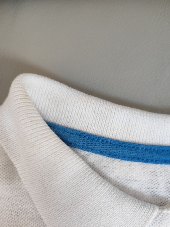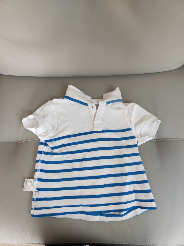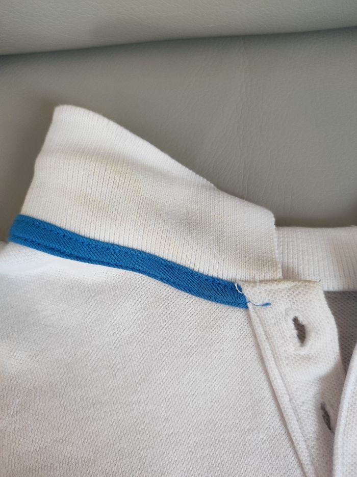 Polo à manches courtes et à rayures, avec quelques traces au col (montrées sur des photos).