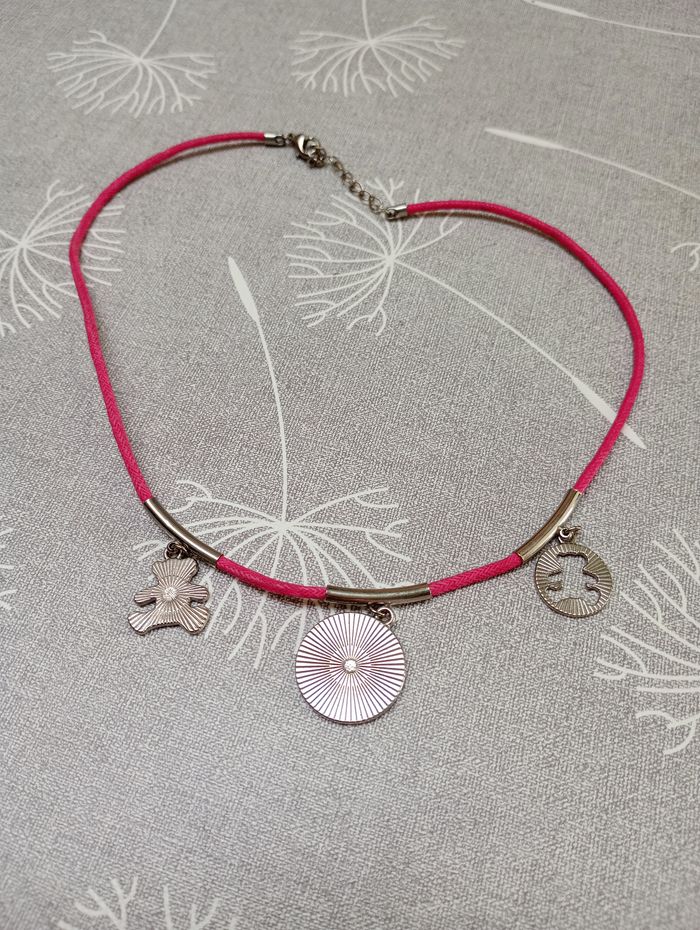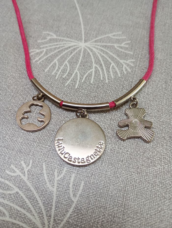 Collier rose avec pendentifs argentés. Longueur totale : 45 cm. Marque : Lulu Castagnette. Très bon état