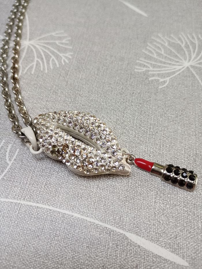 Collier avec lèvres et rouge à lèvres. Quelques strass ont changé de couleur. Longueur lèvres : 5 cm.