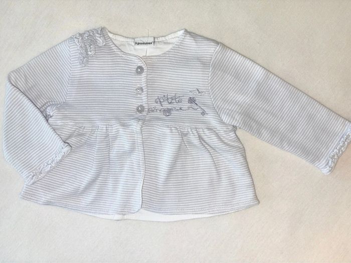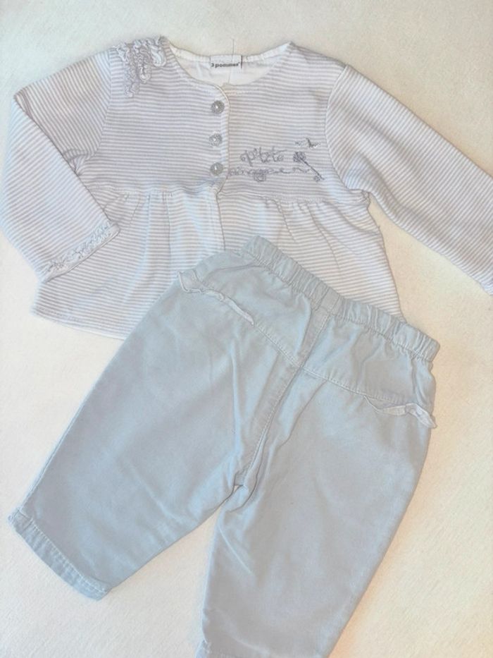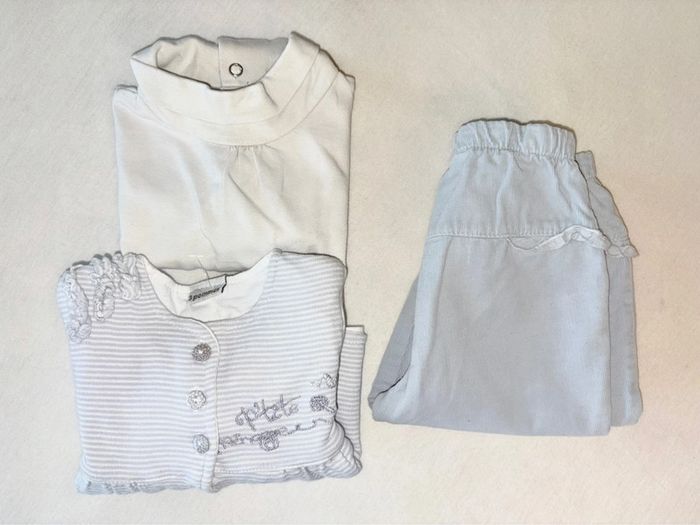 Ensemble 3 pièces t-shirt manche longue blanc, gilet et pantalon. Taille 3 mois En très bonne état