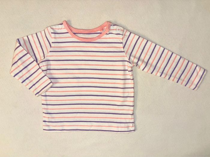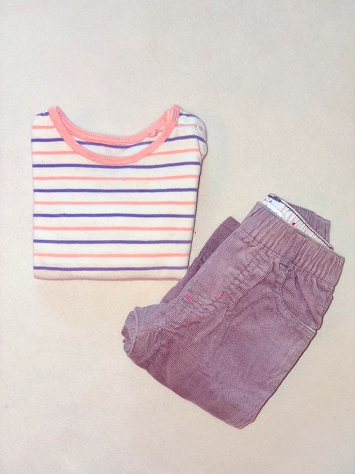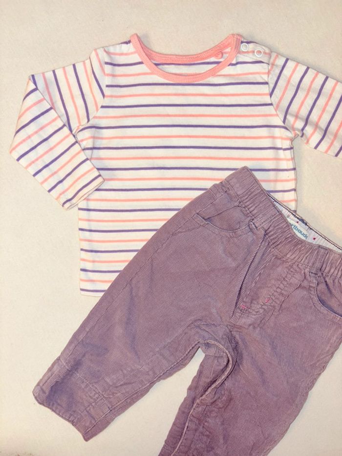 Ensemble t-shirt manche longue à rayure (Lupilu) et pantalon velours côtelé violet (vert baudet) Taille 68 En très bonne état #6mois #taille68 #lotdevetement6mois #ensemblefille6mois #fille6mois #pullfille6mois #bodiefille6mois #pantalonfille6mois #Zara #Disney #orchestra #sergentmajor