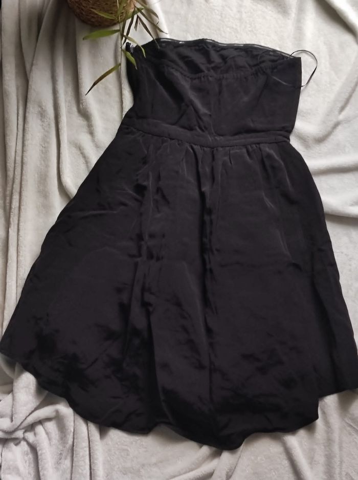 robe bustier noire, partie intérieur avant avec bande collante. Dessous doublé de tulle. Fermeture éclair sur le côté. Étiquette manquante Dimensions Taille poitrine 40 Tour de buste 35 En parfait état