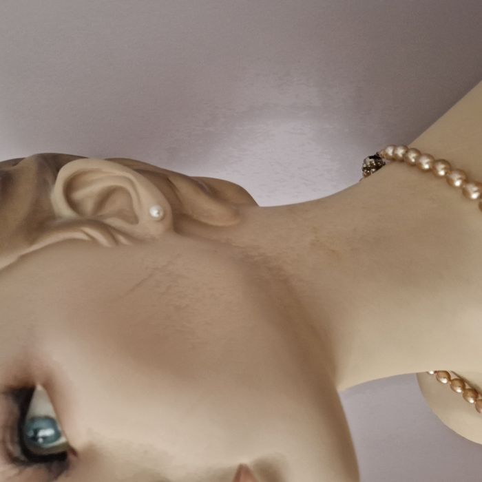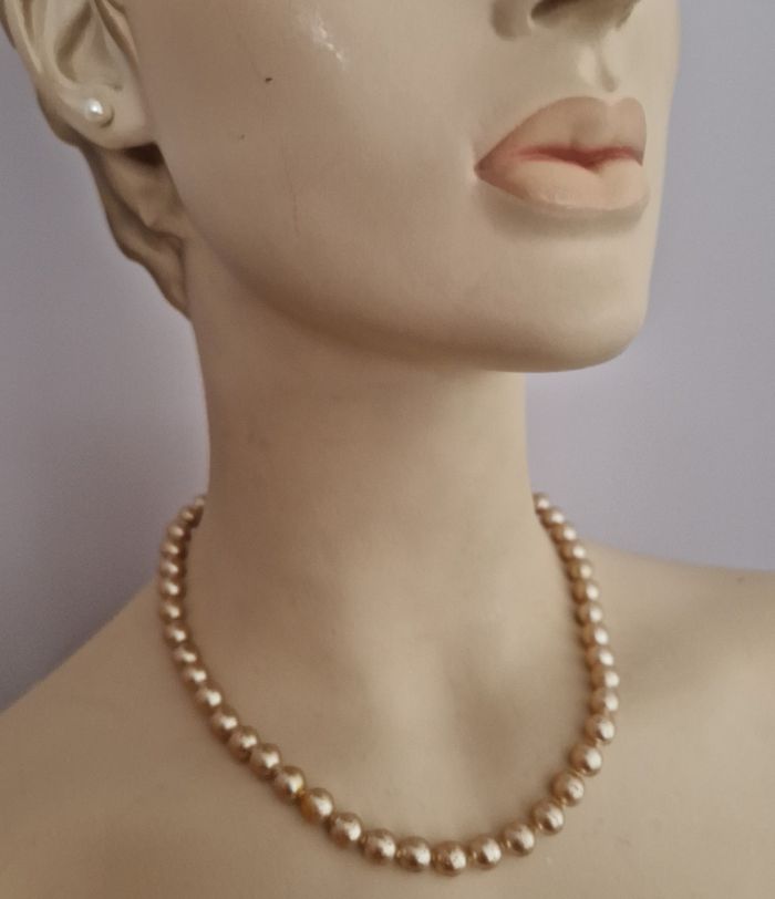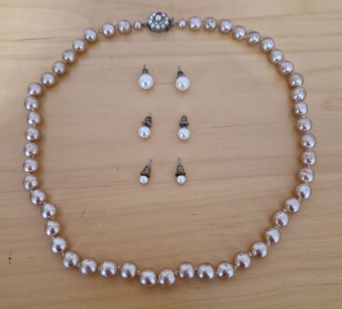 Parure en perles non naturelles composée de : - 1 collier rang simple avec fermoir orné de strass / Etat satisfaisant (notamment 1 strass manquant) - 3 paires de studs avec perles de 3 diamètres différents / TB état