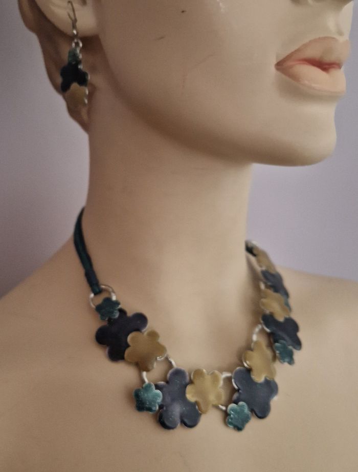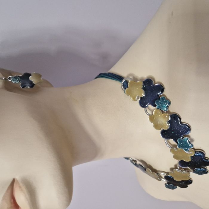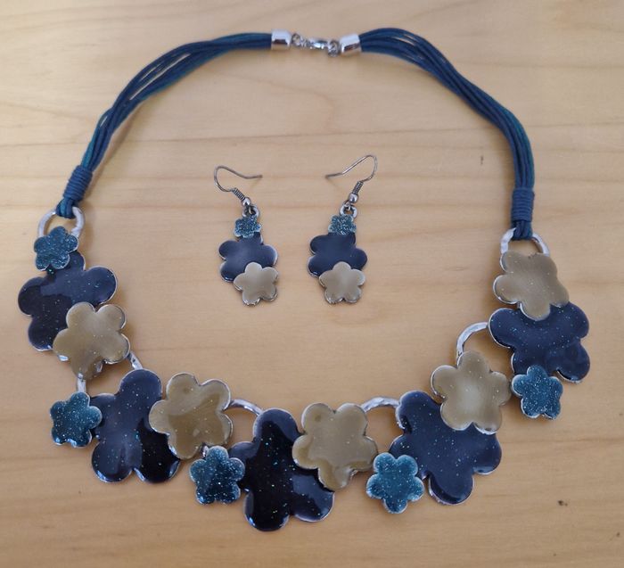 Parure fantaisie collier et boucles d'oreille. Fleurs façon émaux dans un camaïeu de bleu pailleté sur métal inoxydable et cordons multiples Marque : Eva Excellent état, comme neuve. Plusieurs modèles de la même marque disponibles, réduction sur les lots ;) #isa91bijoux #isa91idéecadeau #isa91accessoires #isa91beauté