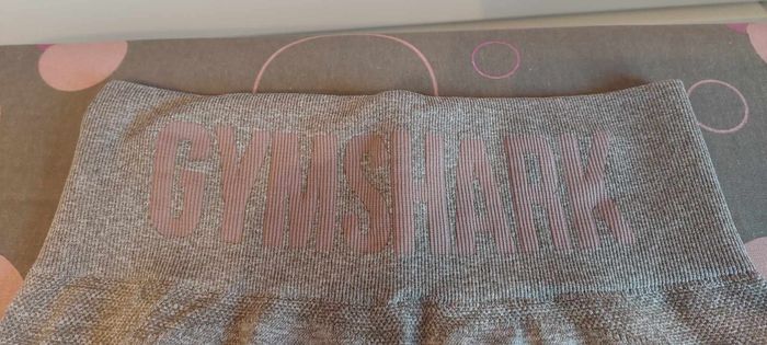 Beau legging de sport pour femme, marque GYMSHARK, de couleur gris clair, taille XS, logo de la marque ceinture arrière ton rose, ceinture doublée en mesh pour aération et résistance et qui reste bien en place, finitions internes élastiquées pour souligner le galbe des fessiers, totalement neuf, jamais porté et toujours vendu 70 € sur le site. En 56 % nylon, 39 % polyester et 5 % elasthane, lavable en machine à 30°. J'ai la brassière de la même marque et même couleur dans mes ventes en taille S.