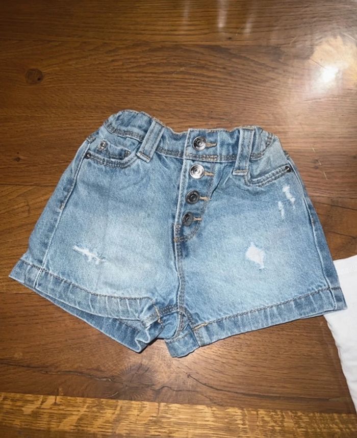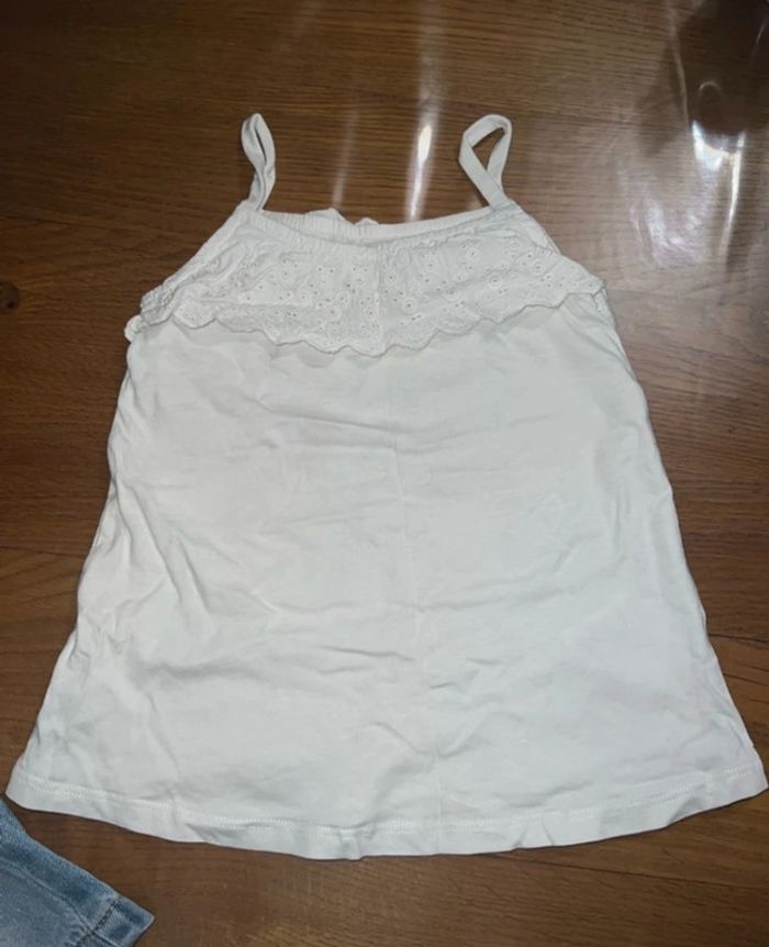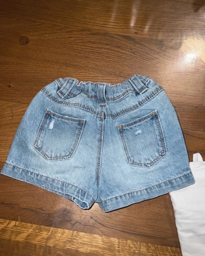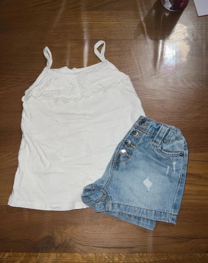 Ensemble composé de : - un short en jean Kiabi taille 4 ans avec élastique à la taille - un t-shirt à bretelles blanc Vertbaudet taille 5 ans Très bon état