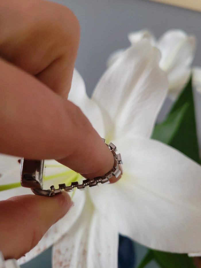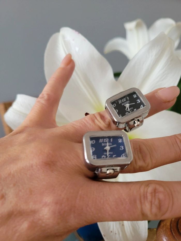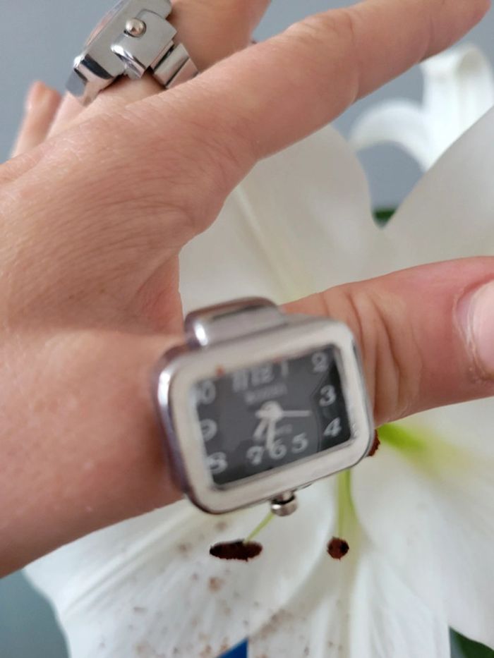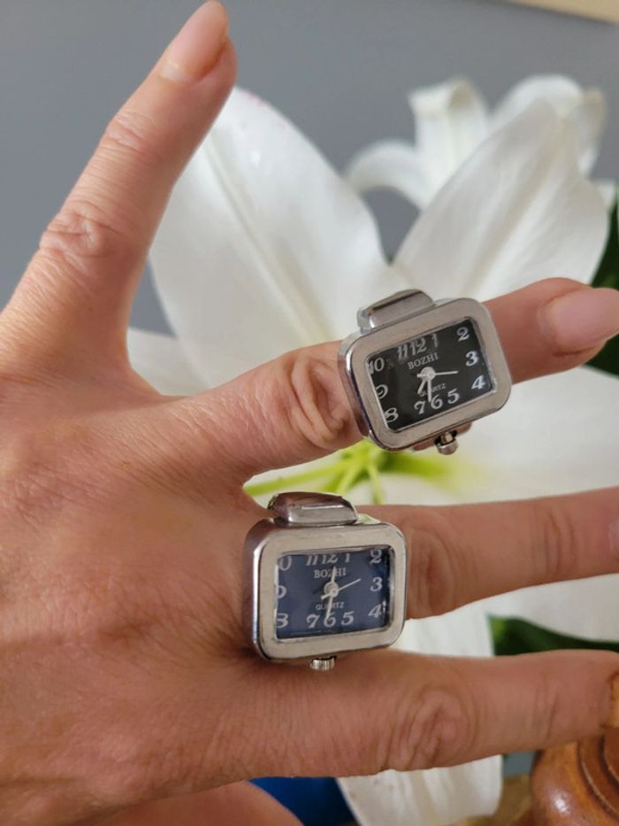 Bague montre rectangulaire fond bleu ou noir. Prix à l unité, lot possible (⚠️ indiquez moi votre choix avant la validation, je vous préparerai une annonce personnalisée) Fonctionne comme une montre classique. Acier inoxydable. Neuve, jamais portée. Pile neuve. Différents modèles dans mon dressing. Ajustable. Non waterproof. Envoi rapide et soigné.