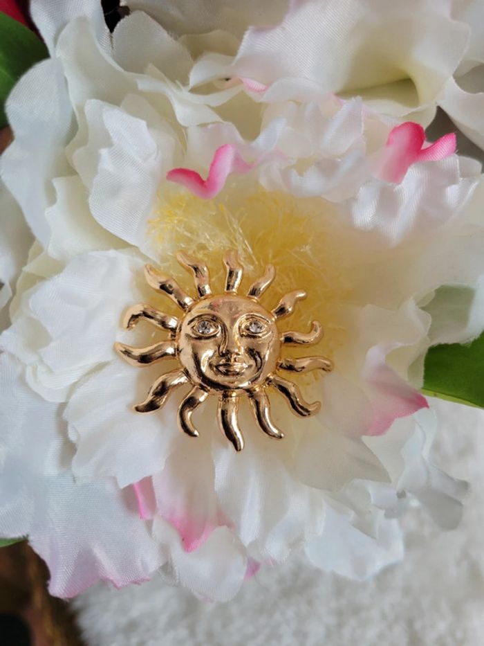 Broche soleil 🌝🌞, dorée. Oeil en zirconium Différents modèles🌝🌞🌝☀️dans mon dressing... Lot possible sur dde. Pochette 🎁 offertes sur demande...