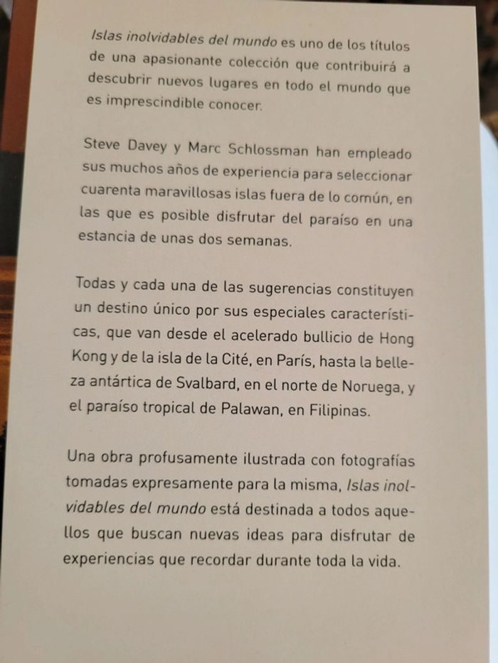Cuarenta destinos que se caracterizan por su variedad: algunos cuentan con playas vírgenes, mientras que otros albergan el bullicio de una gran ciudad. Una guía diferente que defiende un modo respetuoso y conservacionista de viajar a lugares poco conocidos. Texto escrito por expertos viajeros y fotografías que hablan por sí solas, junto con información práctica para trasladarse a una isla determinada. Para escribir este libro, sus autores, Steve Davey y Marc Schlossman recorrieron el mundo durante once meses. Como resultado de ello, en esta obra se describen islas bastante conocidas junto con otras no tan populares y se defiende, al mismo tiempo, una manera de viajar que muestre un respeto por el entorno y por las culturas locales. Las islas incluidas se encuentran en todos los rincones del planeta, y mientras que algunas se caracterizan por la riqueza de su fauna, otras destacan por sus paisajes paradisíacos y unas cuantas por la belleza desértica del entorno: las hay para todos los gustos y presupuestos, y sin duda aportarán más de una idea a todos aquellos que deseen disfrutar de experiencias para recordar durante toda la vida. Quarante destinations qui se caractérisent par leur variété : certaines possèdent des plages immaculées, tandis que d'autres abritent l'agitation d'une grande ville. Un guide différent qui défend une manière respectueuse et écologiste de voyager dans des lieux méconnus. Des textes rédigés par des voyageurs experts et des photographies parlant d'elles-mêmes, ainsi que des informations pratiques pour s'installer sur une île spécifique. Pour écrire ce livre, ses auteurs, Steve Davey et Marc Schlossman, ont parcouru le monde pendant onze mois. Neuf. Envoi sous 24h_48h