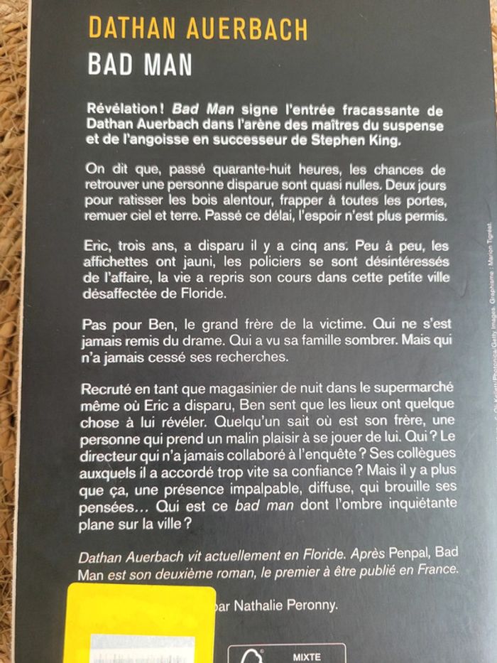 Révélation ! Bad Man signe l'entrée fracassante de Dathan Auerbach dans l'arène des maîtres du suspense et de l'angoisse en successeur de Stephen King. On dit que, passé quarante-huit heures, les chances de retrouver une personne disparue sont quasi nulles. Neuf, étiquette. Envoi sous 24h_48h