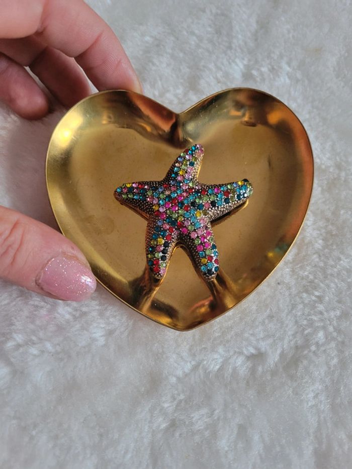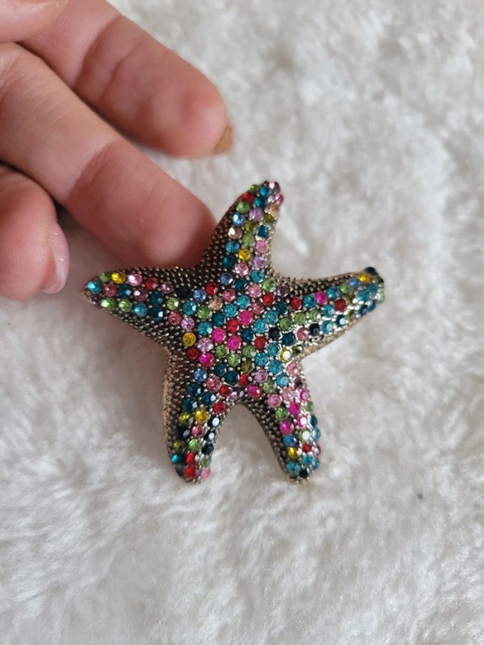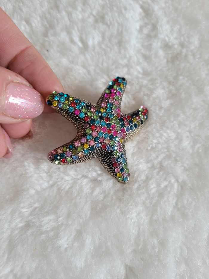 Broche étoile de mer strass multicolores... Celle ci peut aussi se porter en collier grâce à son anneau ( voir les 2 dernières photos 📷) Cordon cuir noir ⚫️ offert sur dde. Neuve, jamais portée. Différents modèles dans mon dressing....lot possible sur dde. Pochette 🎁 offertes sur demande...