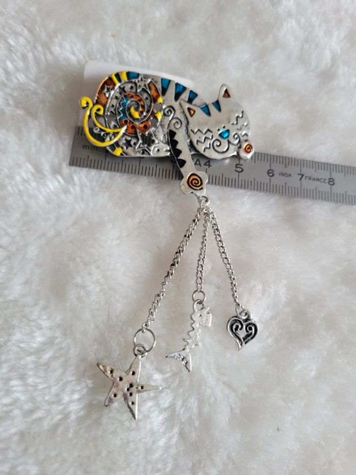 Broche chat acier silver et touche de couleur, et pampilles poisson, etoile de mer et arrête de poisson Neuve, jamais portée. Différents modèles dans mon dressing....lot possible sur dde. Pochette 🎁 offertes sur demande...