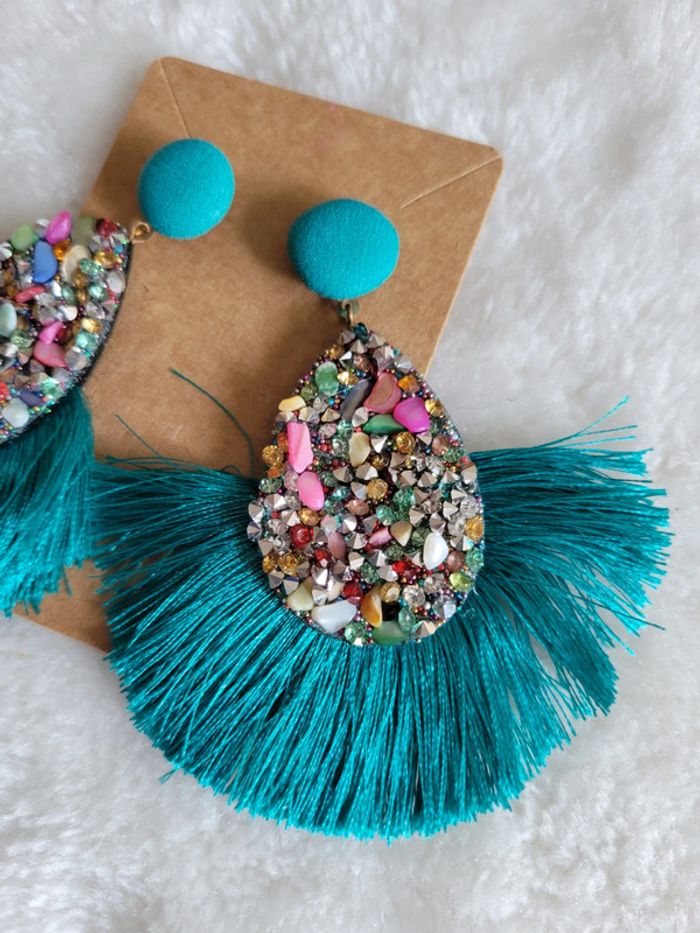 Boucles d oreilles 👂 paillettes et petites pierres multicolores Fil de coton turquoise Tiges et fermoirs en acier inoxydable Hyppoallergeniques Plusieurs couleurs dispos dans mon dressing. Neufs Lot possible avec # articles .... Envoi sous 24h / 48h.