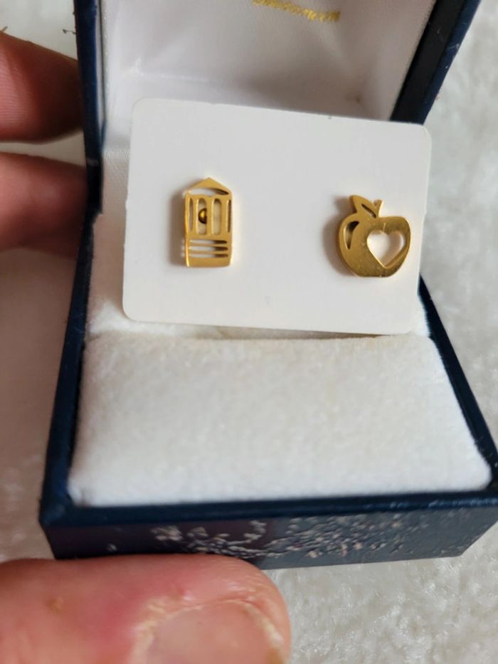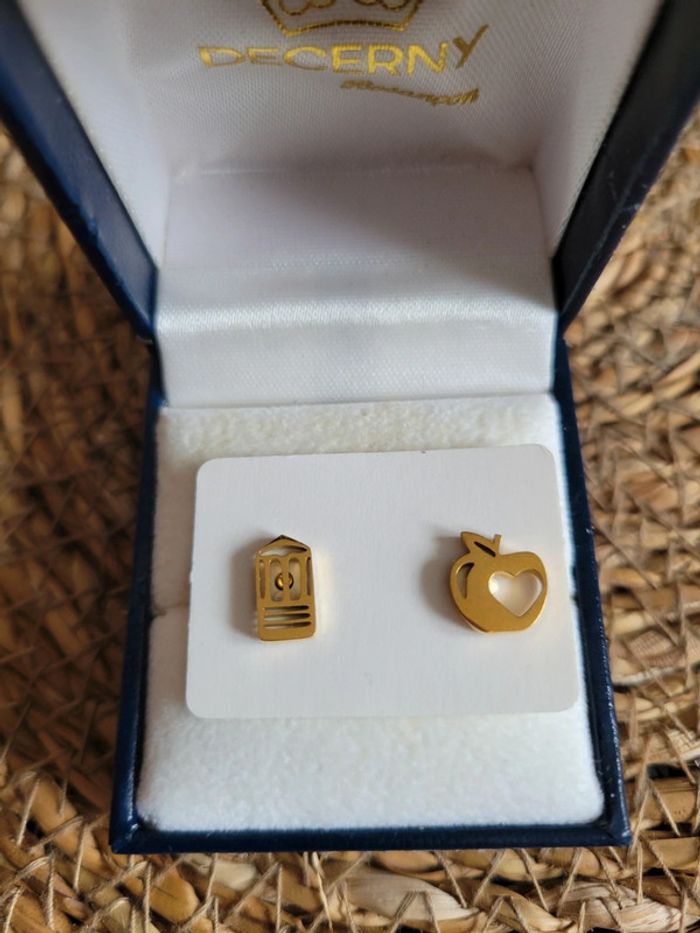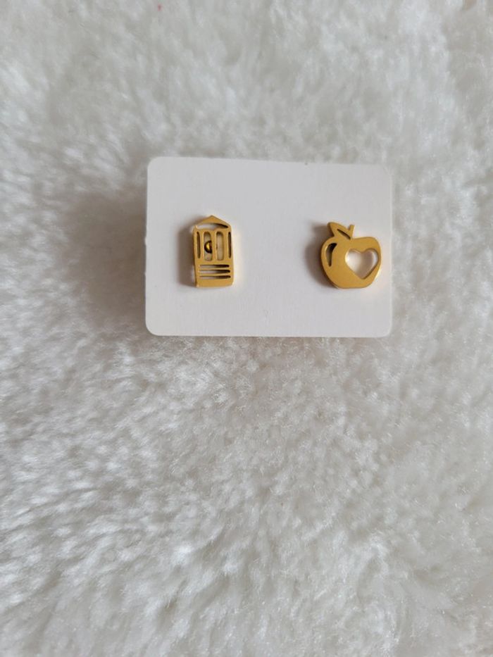 Boucles d oreilles 👂asymetriques. Crayon 🖍 et pommes 🍎 Oreilles percées. Acier inoxydable gold Hypoallergeniques Neuves, jamais portées #modèles dans mon dressing...chien, chat, girafe, arbre de vie, 🦋...🦒🐦.. Envoi sous 24h/48h. Pochette cadeau🎁 offerte sur demande.