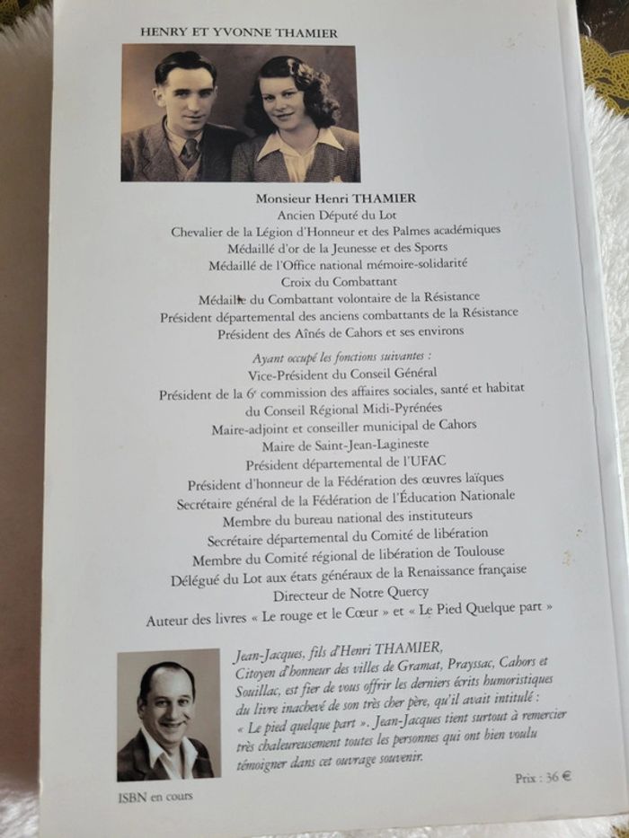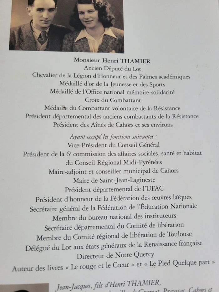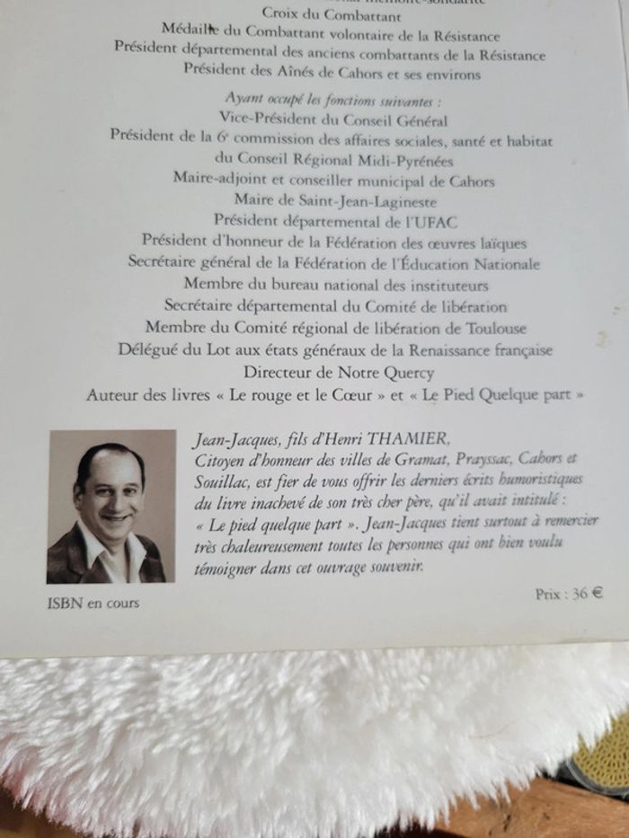 Henri Thamier a été élu 5 fois député du Lot, de 1945 à 1958. Mais c’est à homme « respecté de tous » et au père qu’il était, qui aura grandement marqué la politique d’après guerre lotoise, que son fils Jean-Jacques entend aujourd’hui rendre hommage. La première partie de l’ouvrage retrace sa vie de résistant, d’instituteur « très aimé des élèves », d’homme politique (indéfectible adhérent du PCF durant 68 ans), à travers de nombreux témoignages de personnes qui l’ont côtoyée. « Un portrait révélateur d’une simplicité inversement proportionnelle à son aura… » La seconde partie a été écrite par Henri Thamier lui-même, émanation d’un manuscrit plein d’humour, intitulé Le pied quelque part. Décédé voilà tout juste deux ans à l’âge de 85 ans, une plaque commémorative devrait, à cette occasion être posée sous le porche de la mairie de Cahors.