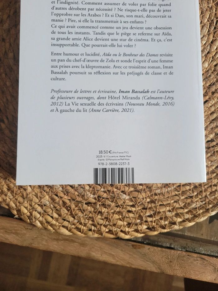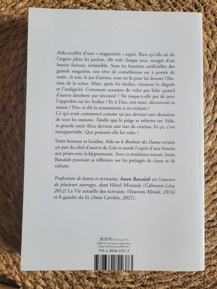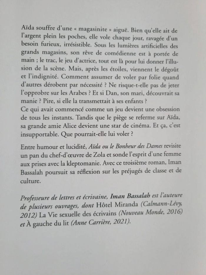 Roman D'Iman Bassalah Aïda souffre d’une « magasinite » aiguë. Bien qu’elle ait de l’argent plein les poches, elle vole chaque jour, ravagée d’un besoin furieux, irrésistible. Sous les lumières artificielles des grands magasins, son rêve de comédienne est à portée de main ; le trac, le jeu d’actrice, tout est là pour lui donner l’illusion de la scène. Mais, après les étoiles, viennent le dégoût et l’indignité. Comment assumer de voler par folie quand d’autres dérobent par nécessité ? Ne risque-t-elle pas de jeter l’opprobre sur les Arabes ? Et si Dan, son mari, découvrait sa manie ? Pire, si elle la transmettait à ses enfants ? Ce qui avait commencé comme un jeu devient une obsession de tous les instants. Tandis que le piège se referme sur Aïda, sa grande amie Alice devient une star de cinéma. Et ça, c’est insupportable. Que pourrait-elle lui voler ? Entre humour et lucidité, Aïda ou le Bonheur des Dames revisite un pan du chef-d’œuvre de Zola et sonde l’esprit d’une femme aux prises avec la kleptomanie. Avec ce troisième roman, Iman Bassalah poursuit sa réflexion sur les préjugés de classe et de culture.