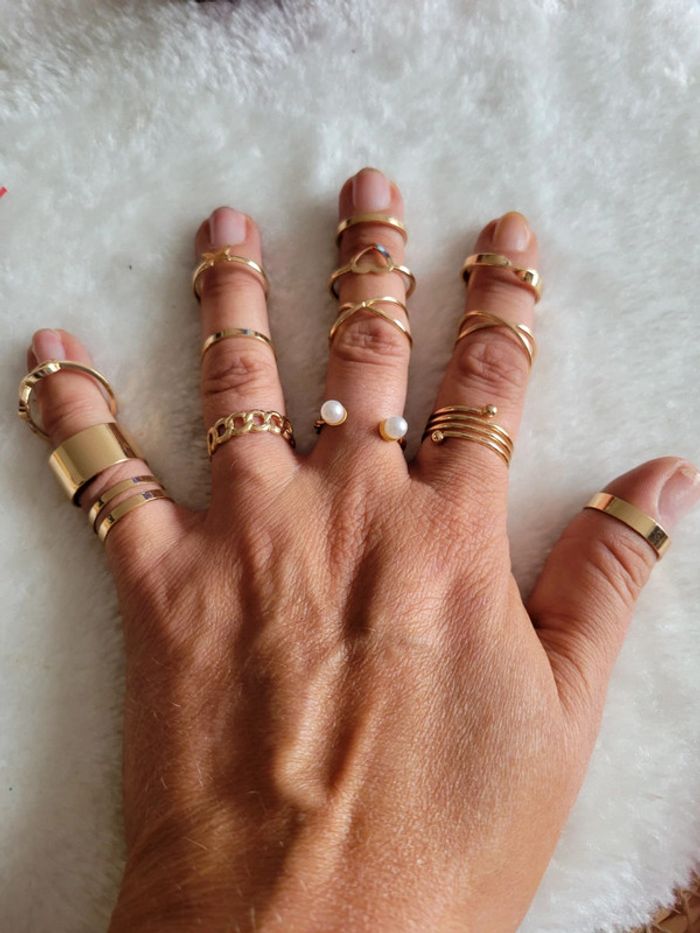 18 bagues dorées Ajustable pour certaines. Différents modèles Neuves Lot possible avec différents articles de mon dressing, sur demande. Je vous préparerai une annonce personnalisée au nom de votre pseudo...🥰👌🙂 Pochette 🎁 sur demande Envoi sous 24h_48h